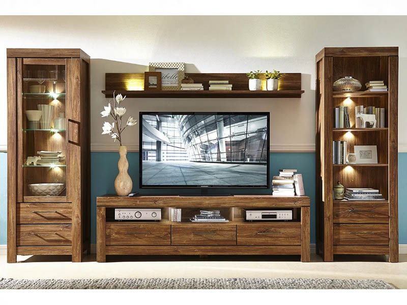 Набор с витриной, стеллажом, TV-тумбой и навесной книжной полкой украсит интерьер, создавая в нем акцент за счет насыщенного оттенка и массивных каркасов. Боковины напольных элементов плавно переходят в устойчивые ножки. По желанию вы можете убрать ненужные предметы либо дополнить гостиную другими модулями из данной коллекции (на фото 3-4).