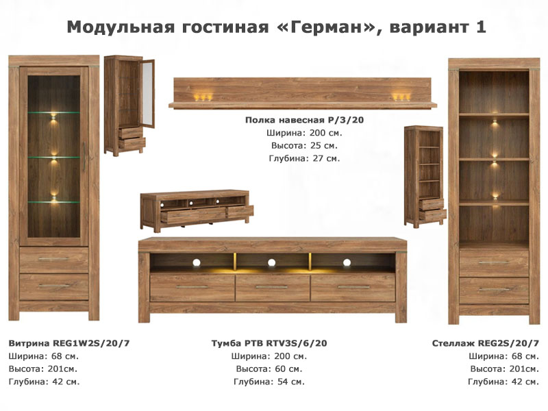 - Тумба РТВ Герман RTV3S/6/20, ШхВхГ: 200х60х54 см. Вес: 68,54 кг. – 1 шт.