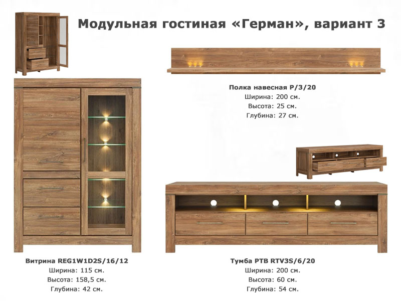 - Тумба РТВ Герман RTV3S/6/20, ШхВхГ: 200х60х54 см. Вес: 68,54 кг. – 1 шт.