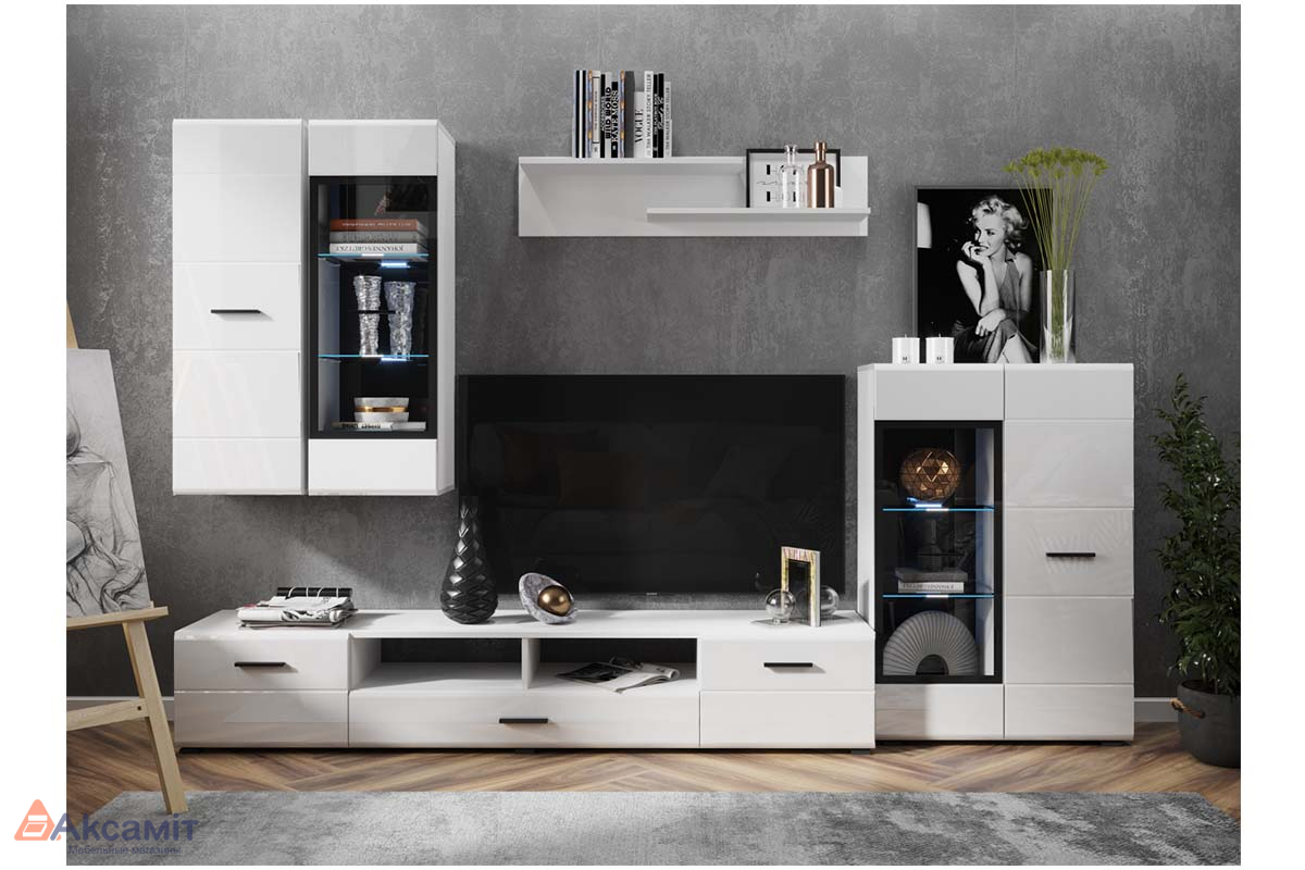 Гостиная Глосс — элегантное решение для меблировки современного интерьера. Глянцевые фасады белого цвета с контрастными черными вставками создают в помещении особую атмосферу. Вместительные модули позволяют организовать удобную и продуманную систему хранения.