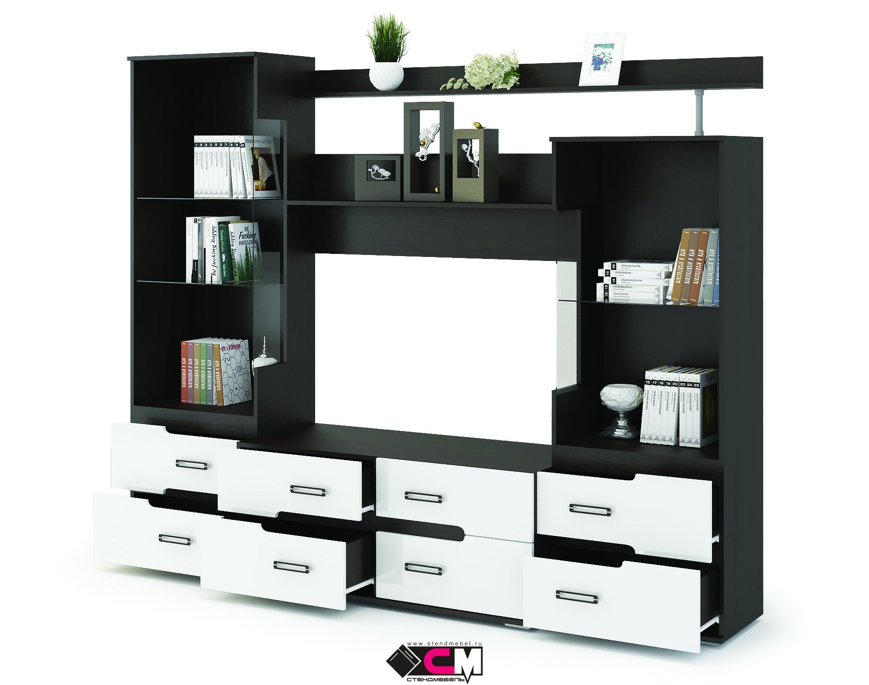 код 103766Стенка в гостиную комнату в комбинированном цвете с глянцевыми фасада. Наличие ниши для ТВ.