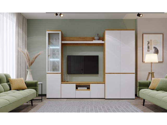 Гретта – это современная мебель для гостиной, в которой прекрасно сочетается естественный оттенок древесного декора «Дуб Крафт золотой» с кристально «Белым». Интегрированные ручки фасадов не оставят Вас равнодушными – дверцы тактильно приятно открывать и закрывать.