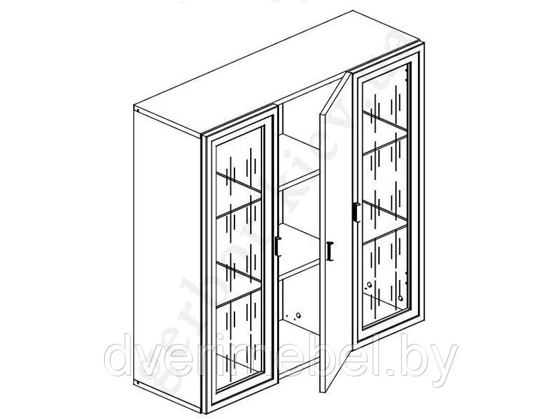 шир./выс./гл. – 90/90/29 см, две двери со стеклянными вставками, за которыми – по две стеклянные полки, по центру – глухая глянцевая дверь с возможностью установки петель справа и слева, две полки внутри;
