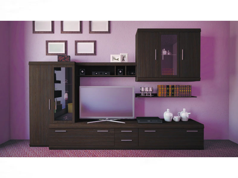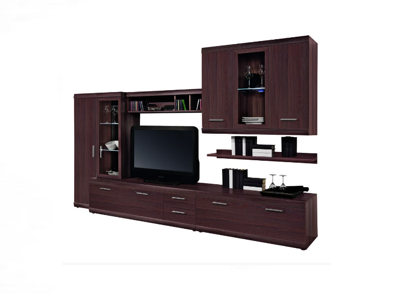 Готовый вариант гостиной представляет собой цельную конструкцию из соединенных между собой модулей. Лицевая сторона мебели декорирована планками МДФ. Темный оттенок с подчеркнутой структурой дерева выглядит благородно и изысканно. Гостиная продается только комплектом и предполагает самостоятельную сборку (схема).