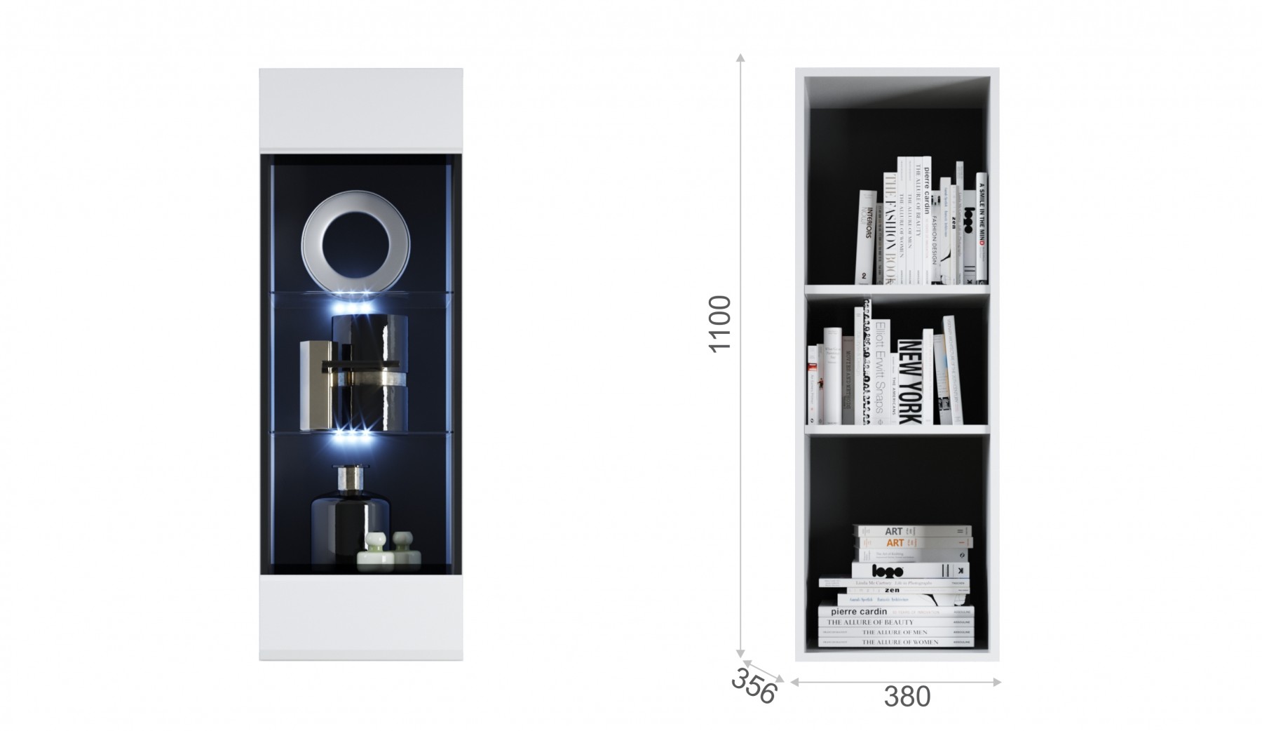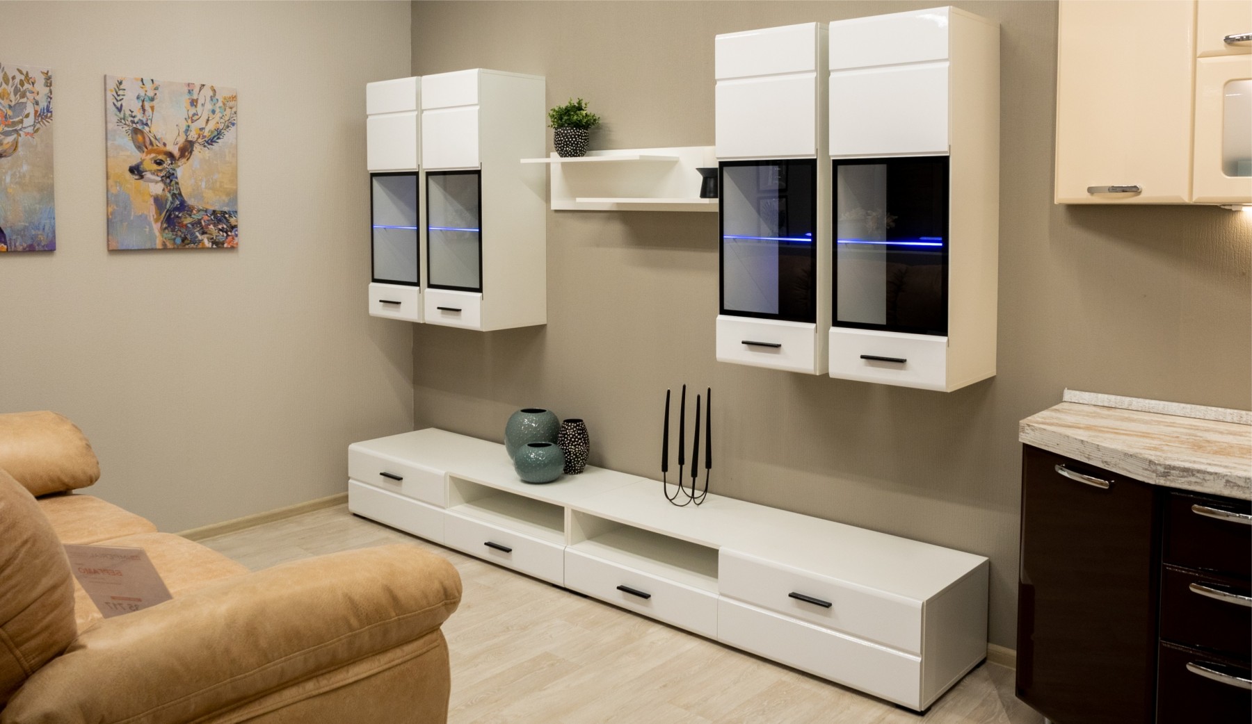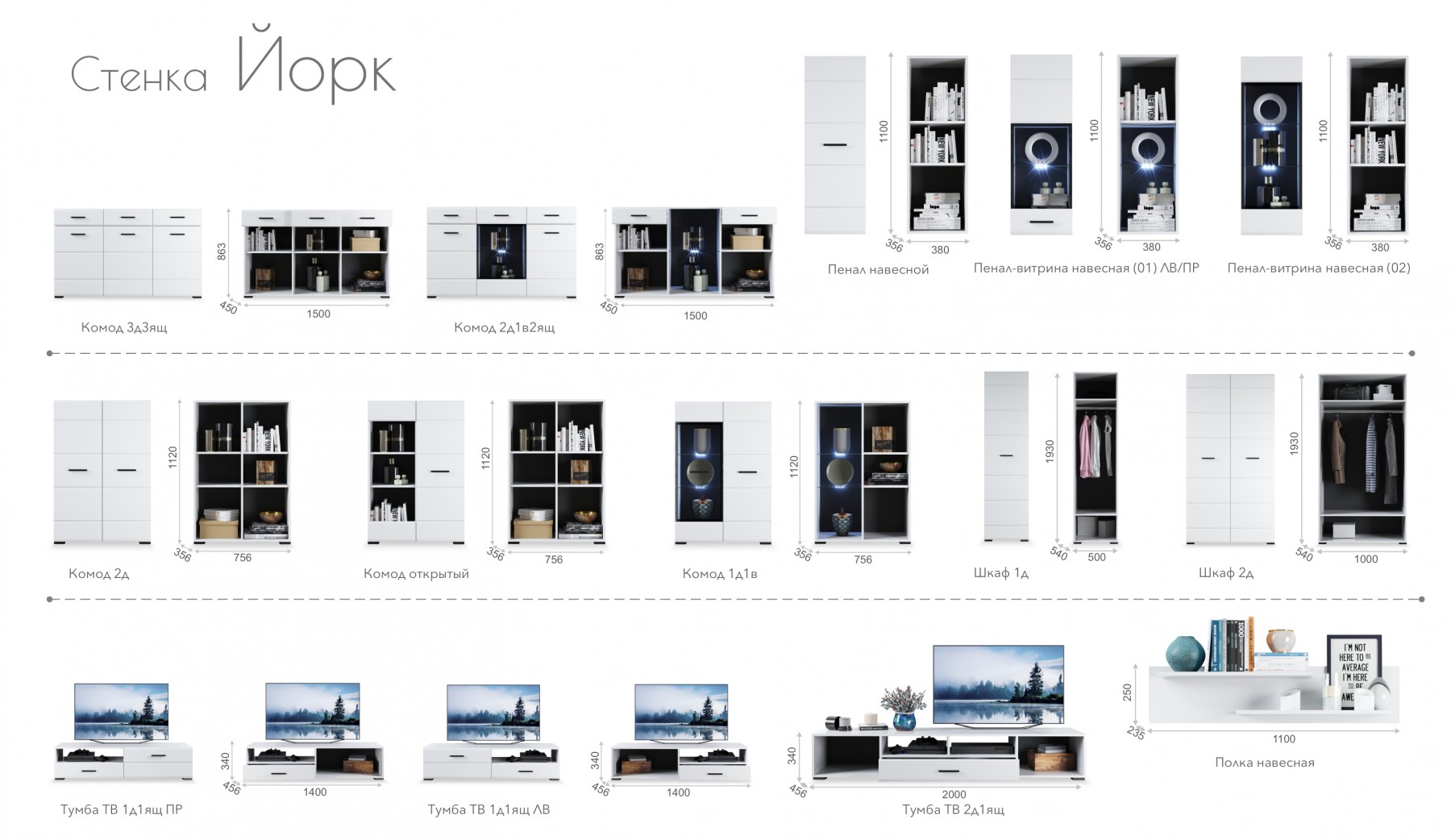 Модульная система Йорк выполнена в стиле минимализма. Строгие, лаконичные линии подчеркивают элегантность комплекта. Белый цвет мебели с деталями глубокого черного визуально сделает комнату светлее, просторнее и позволит составить безупречный по стилю комплект мебели. Сочетание глянцевой и стеклянной поверхностей, открытых полок создадут уютную обстановку и позволят украсить убранство комнаты приятными мелочами и разместить любимые книги и фото. Светодиодная подсветка придаст индивидуальность Вашей мебели. А широкая тумба для ТВ с выдвижными ящиками на телескопических направляющих позволит удобно разместить телевизор любой диагонали и другие медиаустройства Модульная система позволит подобрать по размеру вариант именно для Вашей комнаты, не оглядываясь на фиксированный размер, как в других стенках. Мебель выполнена из экологически безопасных материалов.