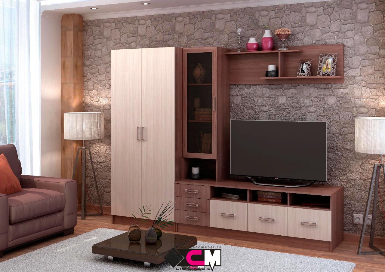 код 103775Компактная стенка в гостиную, выполнена в контрастном сочетании светлых и темных оттенков. В комплект входит двустворчатый шкаф.