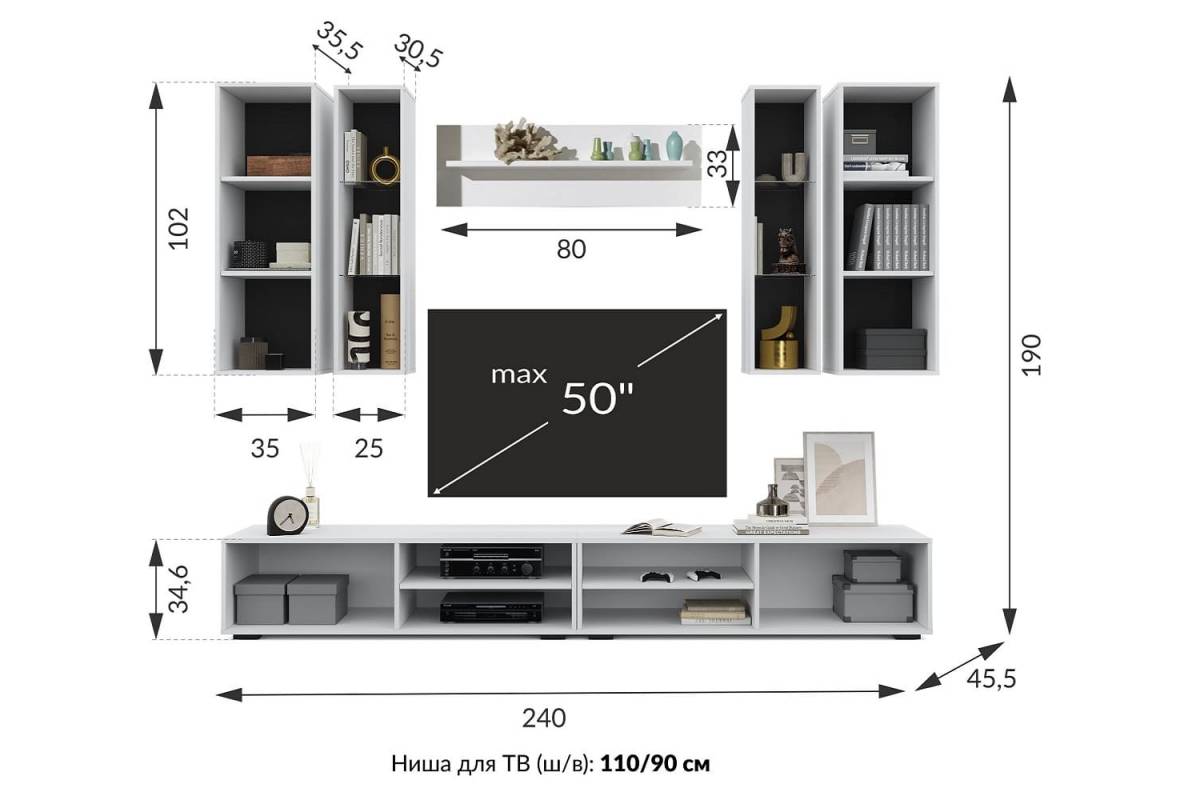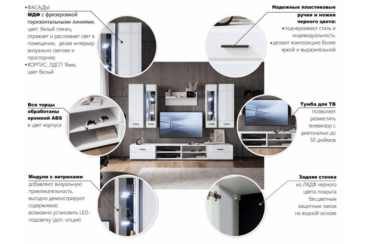 Особенности: широкая тумба под телевизор, которая вместит не только ТВ, но и другие устройства, такие как музыкальные плееры или игровые консоли. Компактные навесные модули позволяют эффективно организовать пространство, не занимая лишнего места, а навесная полка станет отличным местом для книг, декора или предметов первой необходимости.