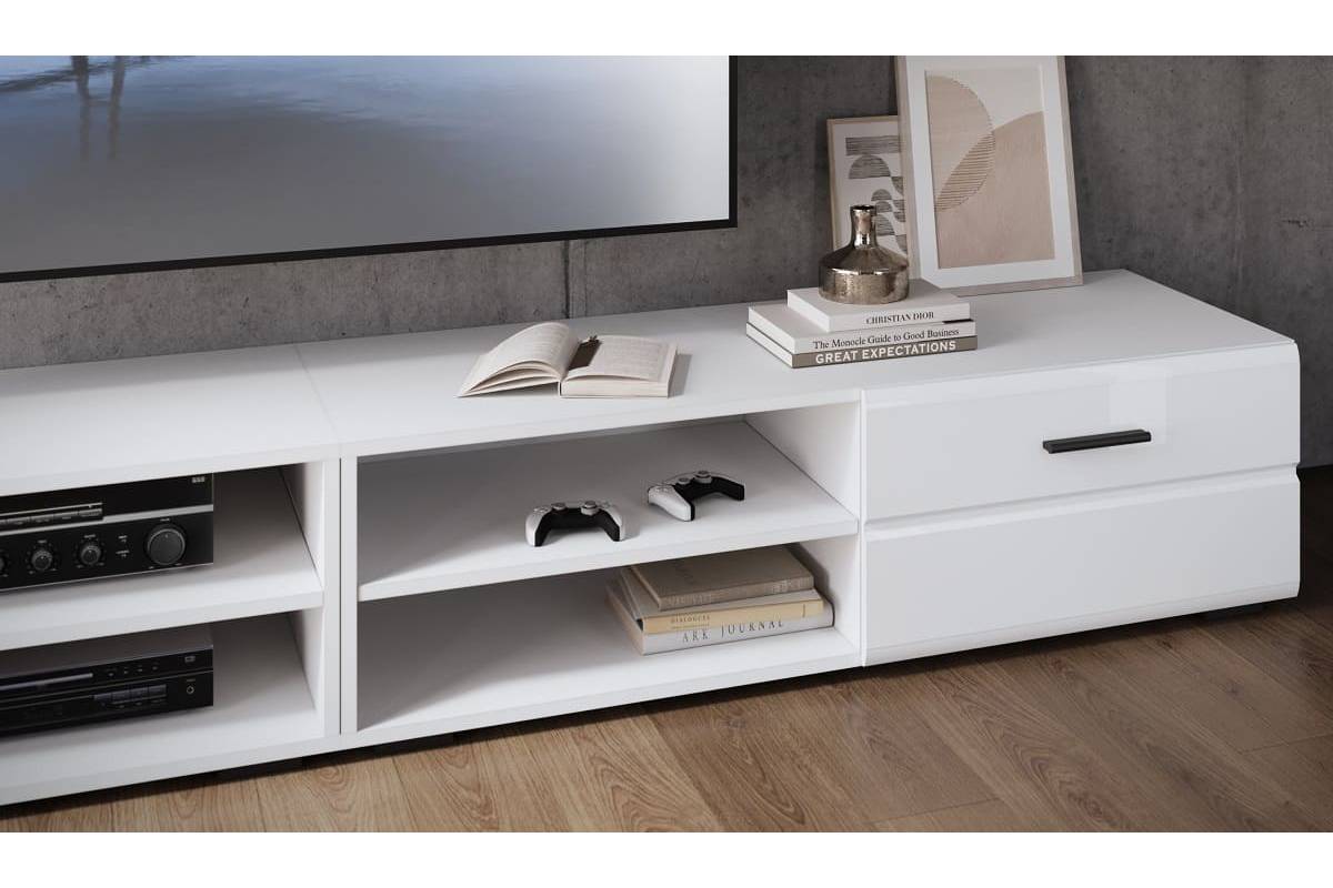 - Просторная тумба под ТВ и компактные модули для удобства хранения.