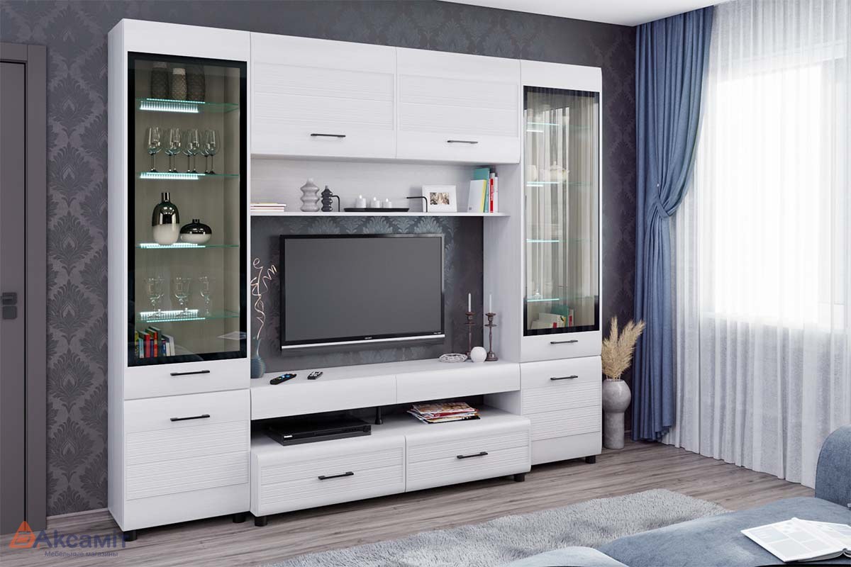 Современная стенка со светлыми фасадами. Стильный дизайн.