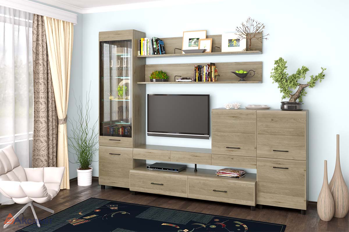 Модульная коллекция корпусной мебели для гостиной. Материал: МДФ покрытый плёнкой, ЛДСП.