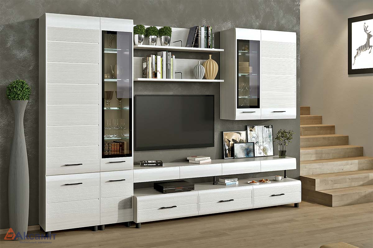 Современная стенка в гостиную с нишей для ТВ, выдвижными ящиками, распашными шкафчиками и открытыми полками.