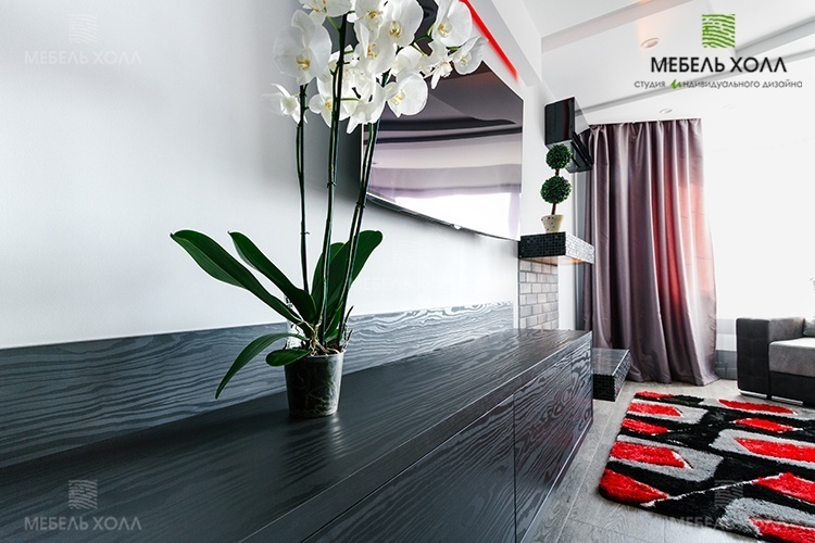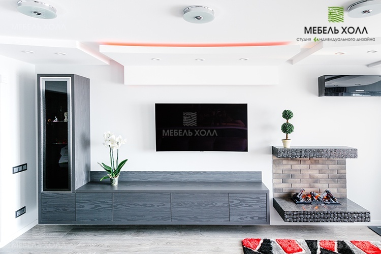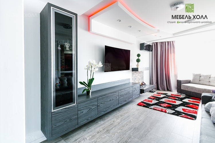 Гостиная с подвесными тумбами и шкафом. Выполнена из ДСП Cleaf. Шкаф оснащен тонированным стеклом графит. Фурнитура Blum.
