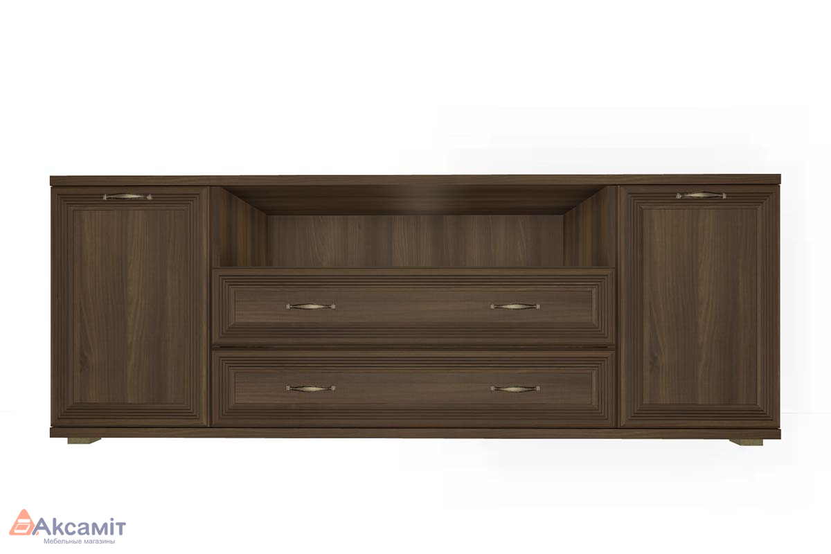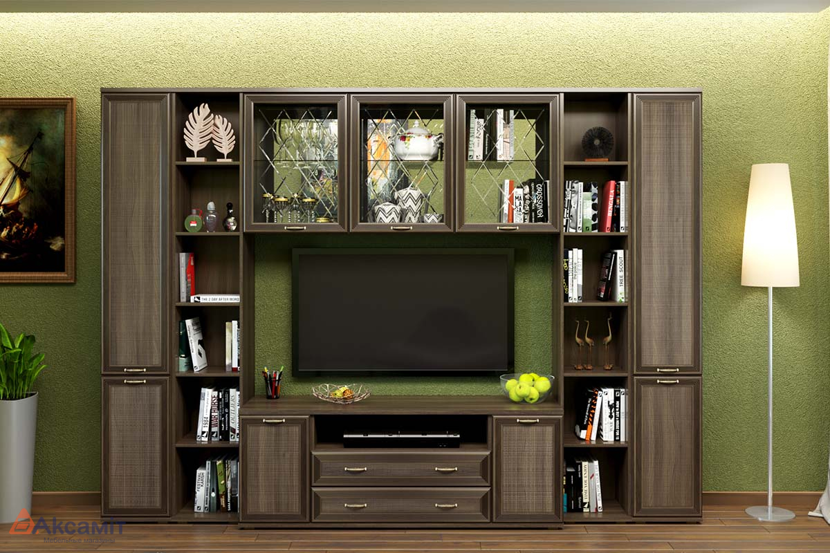 Вместительная система хранения, наличие тумбы для ТВ, открытых полок и шкафчиков.
