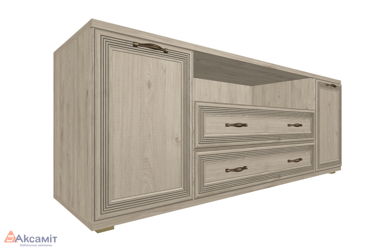 Вместительная система хранения, наличие тумбы для ТВ, открытых полок и шкафчиков.