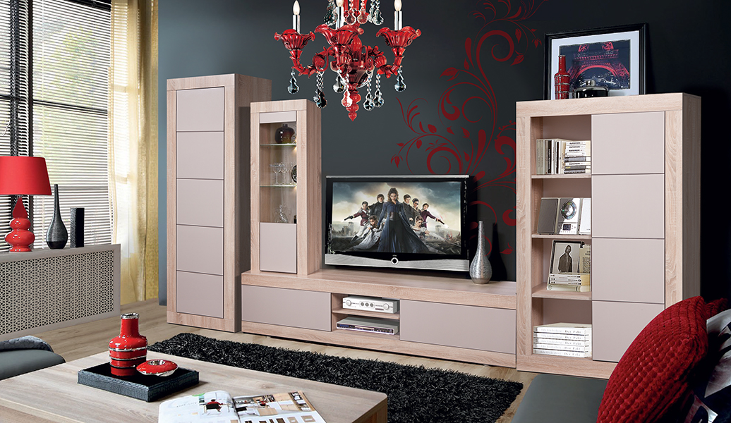 В комплекте: пенал со стеклом, шкаф платяной, полка закрытая, тумба ТВ.