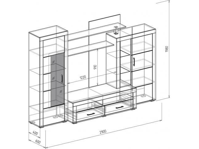 Габаритный размер гостиной: ширина - 2900 мм, высота - 1980 мм, глубина - 600 мм (по тумбе), 400 мм (по пеналам)