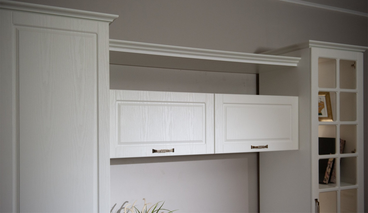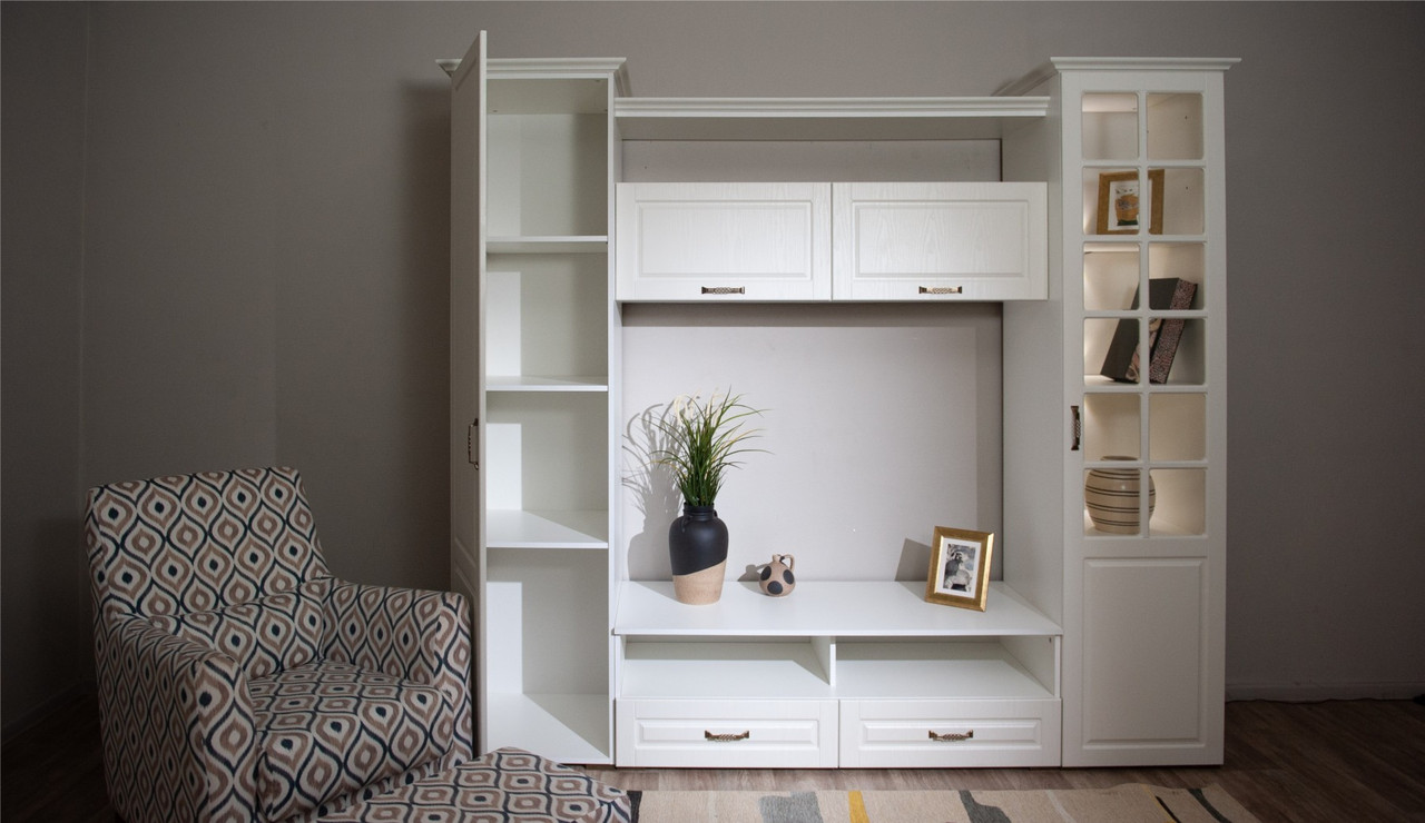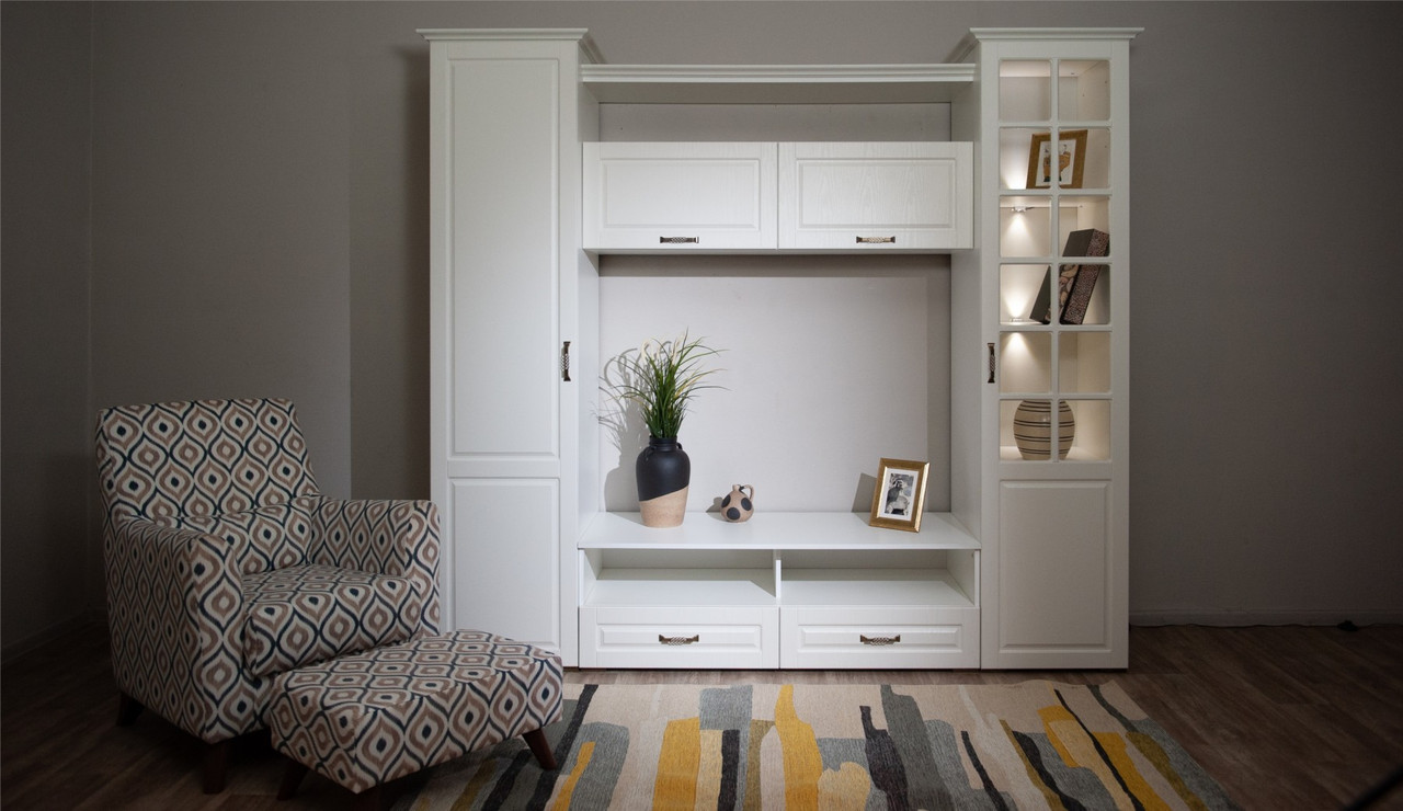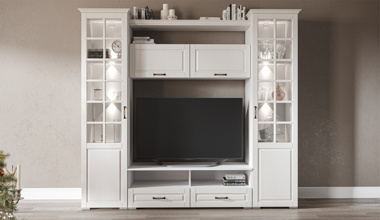 Функциональная стенка Лацио создана для тех, кто ценит комфорт, уют и эргономику. Сочетание белоснежного цвета и стеклянных фасадов визуально расширяет пространство, добавляет света и лёгкости. Декоративными элементами стенки служат фрезерованные фасады из МДФ с текстурой дерева и фигурный карниз. В шкафу с прозрачными витринами будет идеально смотреться красивая посуда. Тумба для ТВ с открытыми и закрытыми полками разместит приставки, медиа устройства. Система Лацио состоит из множества отдельных модулей, благодаря чему можно легко подобрать мебель для комнаты любого размера и нужного вам функционала.