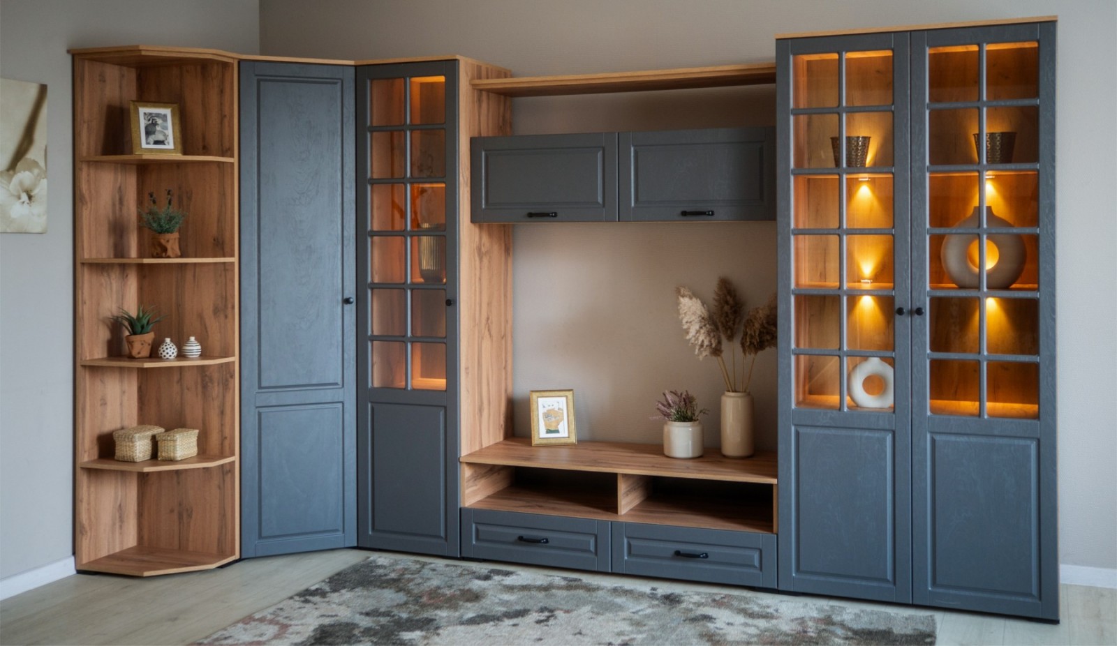 В цену входит: тумба ТВ, витрина 1д, витрина 2д, шкаф навесной с полкой, шкаф угловой, окончание.