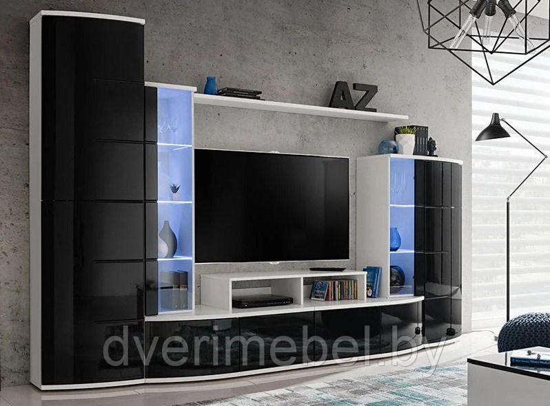Коллекция модульной мебели с белыми глянцевыми фасадами для гостиной. Материал: МДФ, ЛДСП.