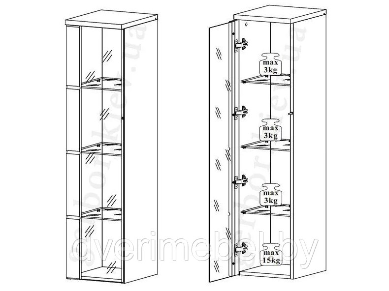 шир./выс./гл. – 30/122/40 см, одна дверь со стеклянной вставкой, внутри три стеклянные полки;