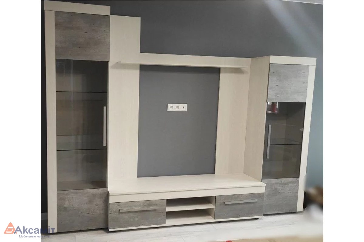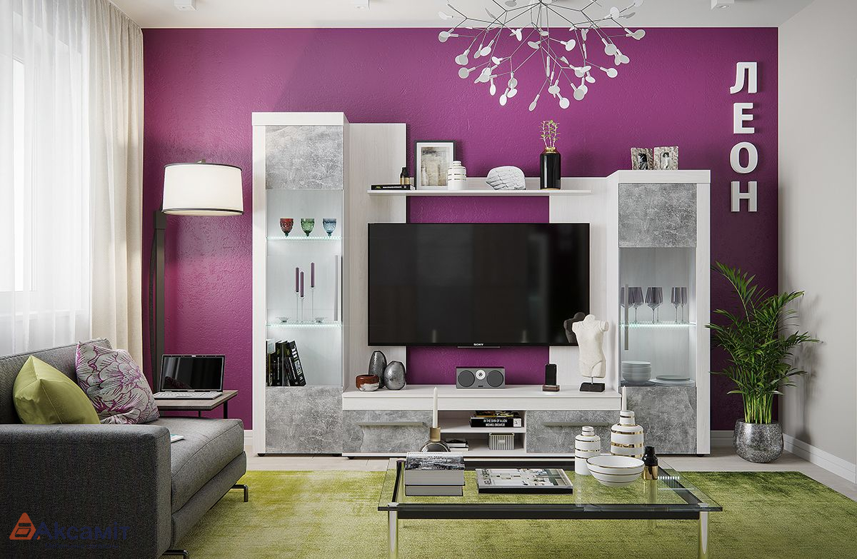 Законодатели интерьерных тенденций “сдали” бетону кухню, ванную, облицовку стен и пола, а теперь уже и мебель для других комнат. Особенно гармонично материалы “под бетон” выглядят в лофтах - популярных однокомнатных планировках недорогих квартир, ориентированных на молодую аудиторию. Спокойный и мужественный “бетонный” декор Ателье Светлый на фасадах стенки ЛЕОН облечен в раму из древесного декора Ясень Анкор светлый.