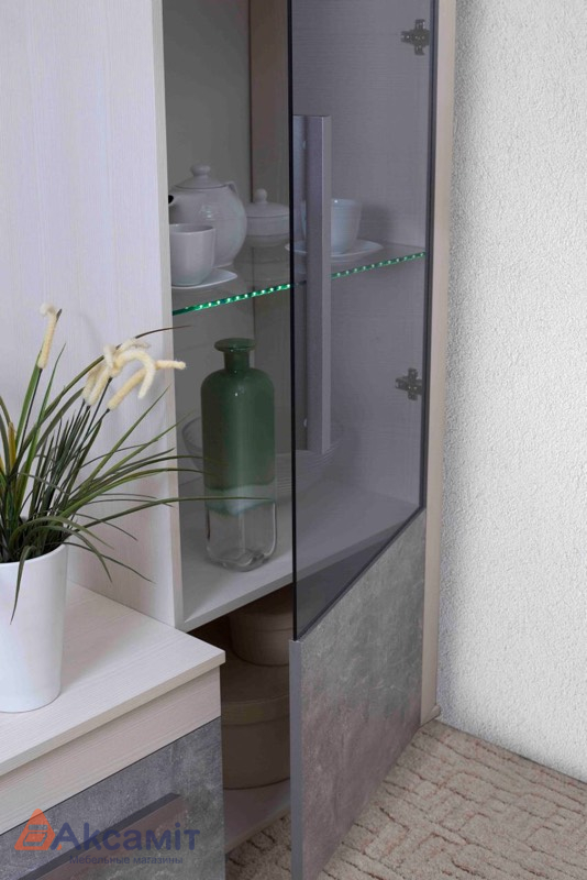Удачно подобранные ручки оттеняют красоту бетона. Они изготовлены из массива дерева и окрашены в серебристый цвет. Фасады витрин мебельной коллекции ЛЕОН выполнены из тонированного серого стекла. Сдержанный и благородный оттенок соответствует всем свежим тенденциям интерьерного дизайна. Поэтому к гостиной ЛЕОН так легко подобрать современные светильники и аксессуары для дома.