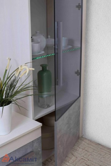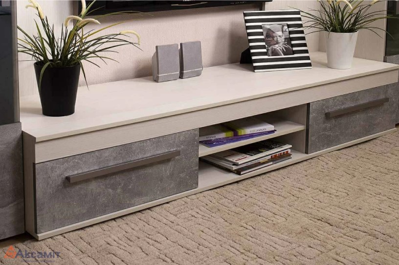 Законодатели интерьерных тенденций “сдали” бетону кухню, ванную, облицовку стен и пола, а теперь уже и мебель для других комнат. Особенно гармонично материалы “под бетон” выглядят в лофтах - популярных однокомнатных планировках недорогих квартир, ориентированных на молодую аудиторию. Спокойный и мужественный “бетонный” декор Ателье Светлый на фасадах стенки ЛЕОН облечен в раму из древесного декора Ясень Анкор светлый.