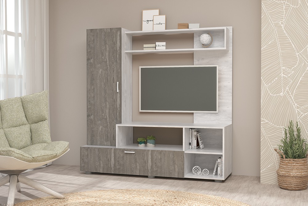 Современная стенка в гостиную с нишей для ТВ, выдвижными ящиками, распашными шкафчиками и открытыми полками.