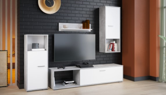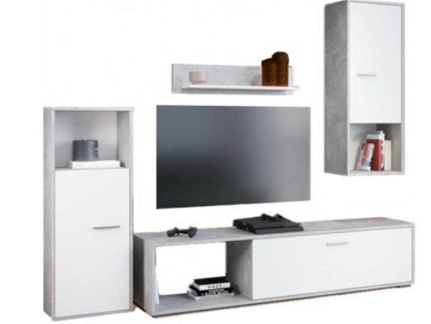 Мини-стенка «Лино» — это готовое бюджетное и функциональное решение, имеющее в составе всё необходимое для установки и использования в современной гостиной: открытые полки и закрытые шкафчики, большая ниша для телевизора. Дизайн в стиле эко-минимализм, строгая геометрия линий гармонизирует пространство, а нейтральное сочетание белого цвета с модной имитацией бетонного покрытия наполняет комнату простором и свободой, добавляет света и свежести.