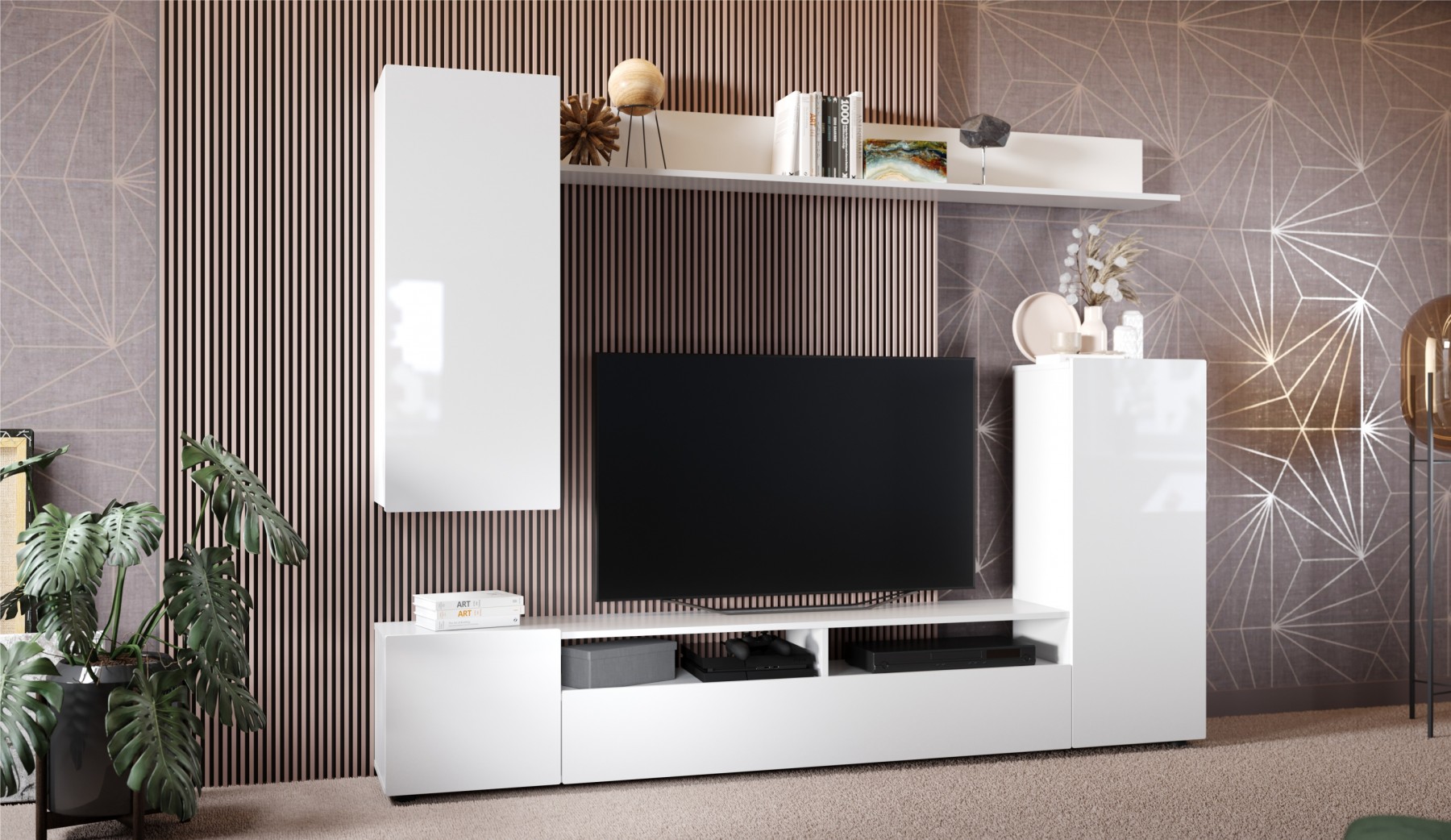 Стенка Лия выполнена в современном европейском стиле. Её дизайн совмещает в себе современные тренды: белый глянец, скругленные фасады МДФ, отсутствие лицевой фурнитуры. Белый цвет отлично сочетается со всей цветовой палитрой, что позволяет создавать яркий интерьер и компоновать с другой мебелью. Стенка включает в себя нишу под ТВ с открытыми и закрытыми полками для размещения приставок, медиа устройств, книг и элементов декора. Дополнительно гостиная комплектуется точечной подсветкой.
