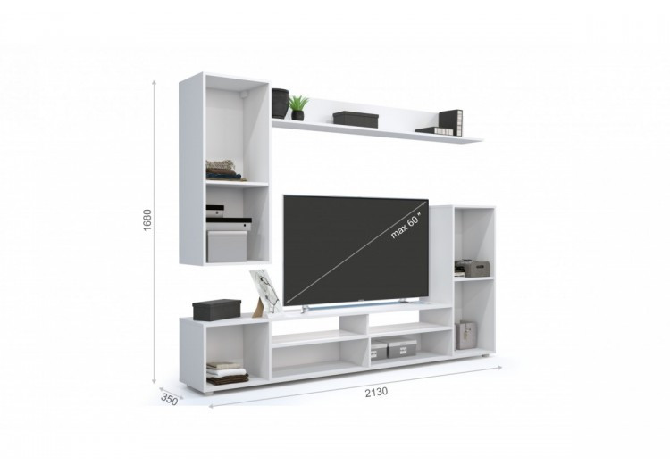 Гостиная имеет единое исполнение, конструктивно состоящее из полки пеналов и тумбы под тв.