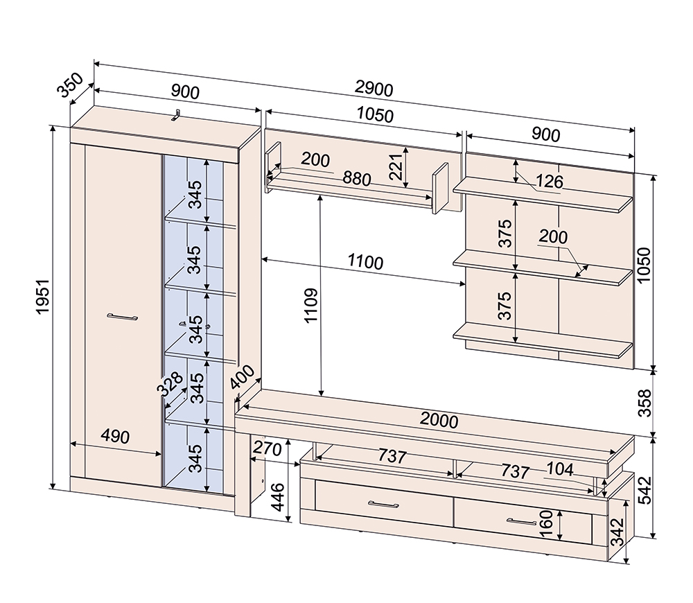 Размер (ШхВхГ): 2800х1966х544 мм. Материал: ЛДСП, стекло, профиль МДФ.