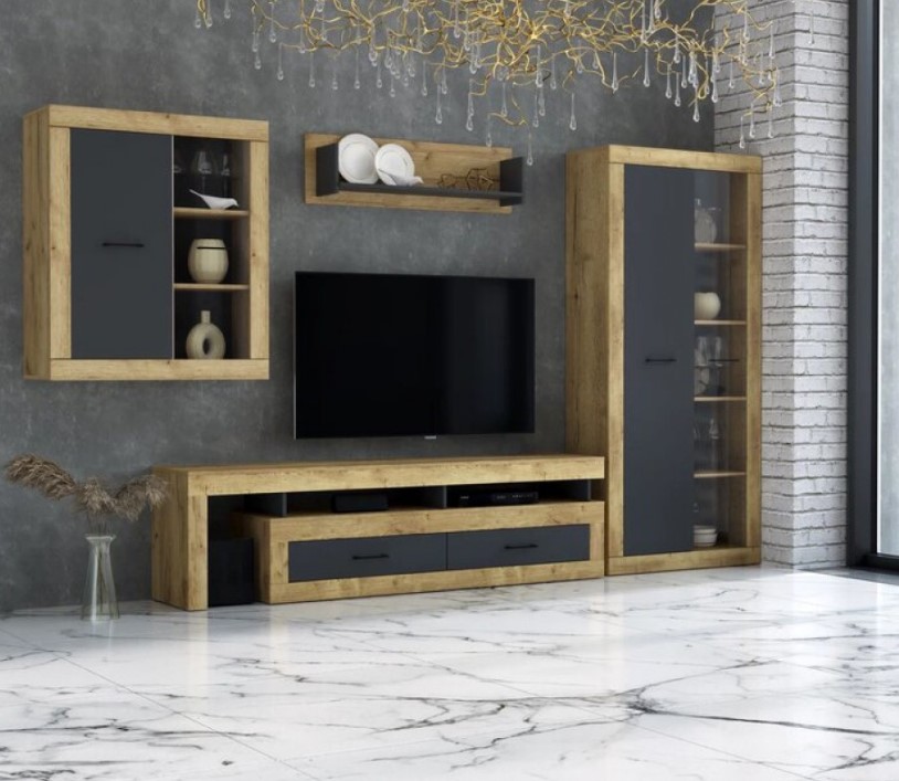 Модульная коллекция мебели в благородном древесном цвете для гостиной. Материал: ЛДСП, МДФ.
