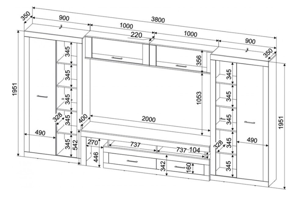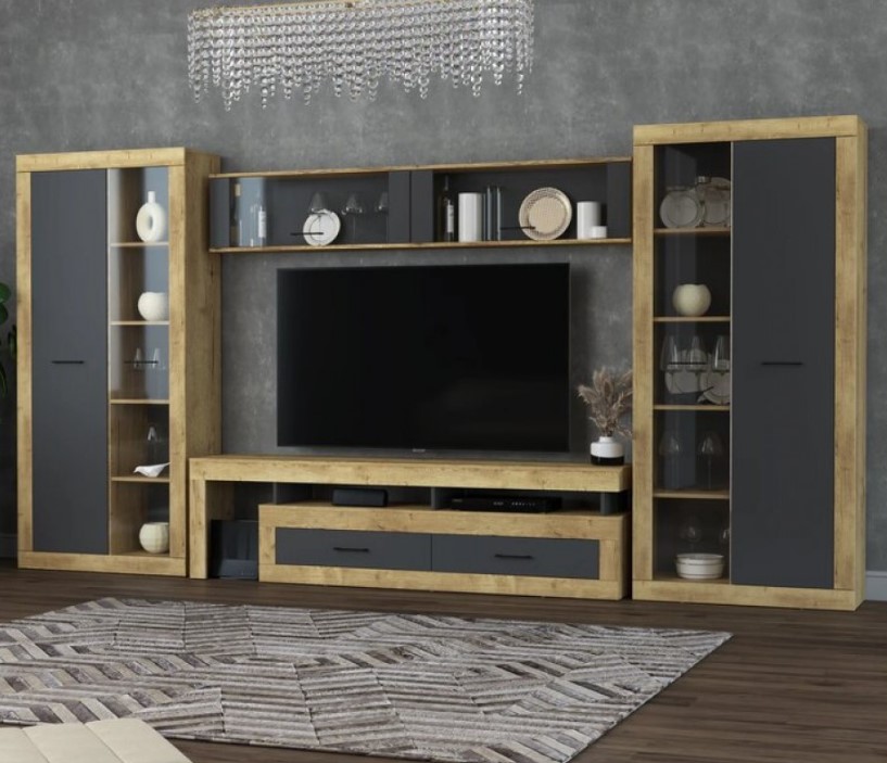 Вместительная система хранения, наличие тумбы для ТВ, открытых полок и шкафчиков.