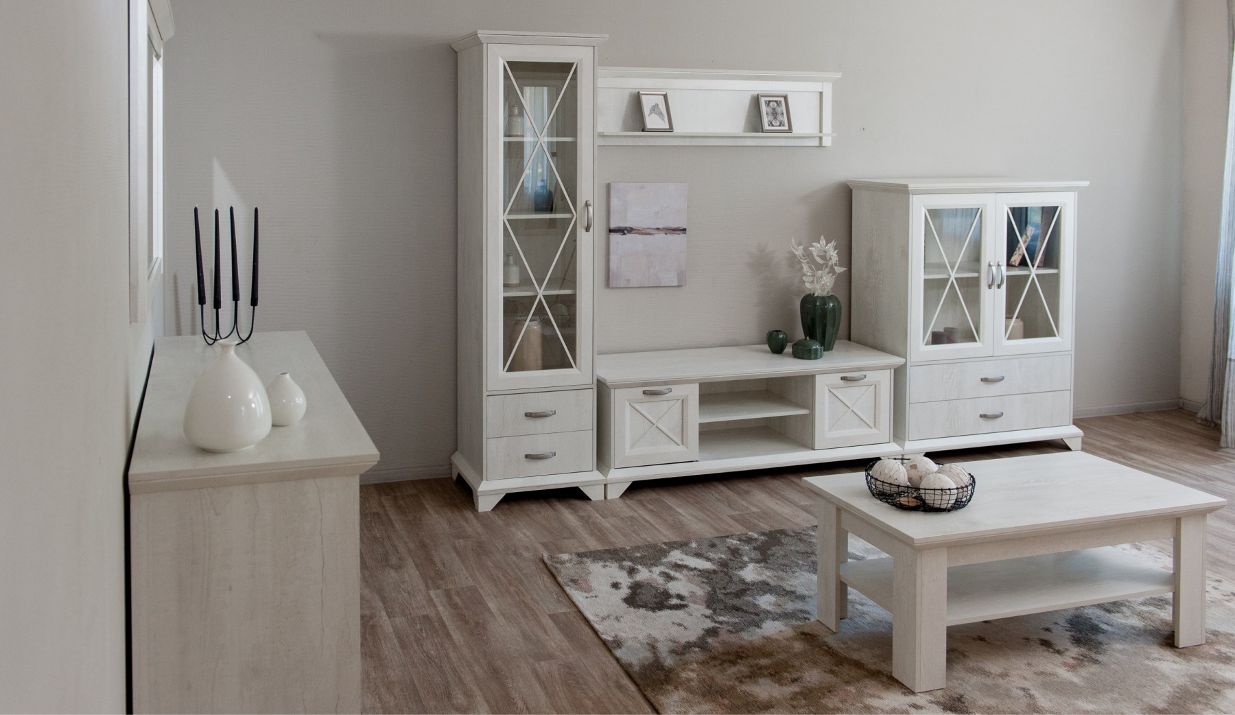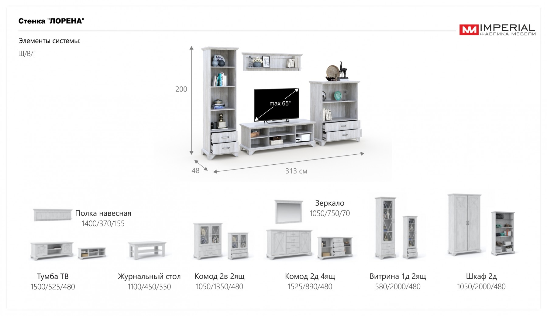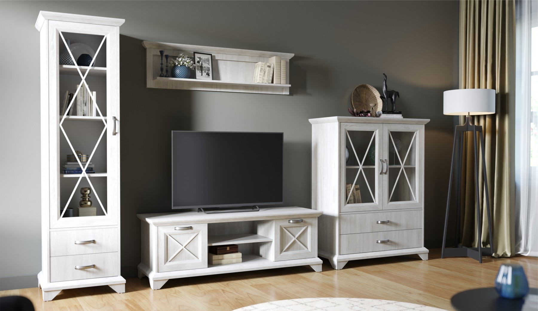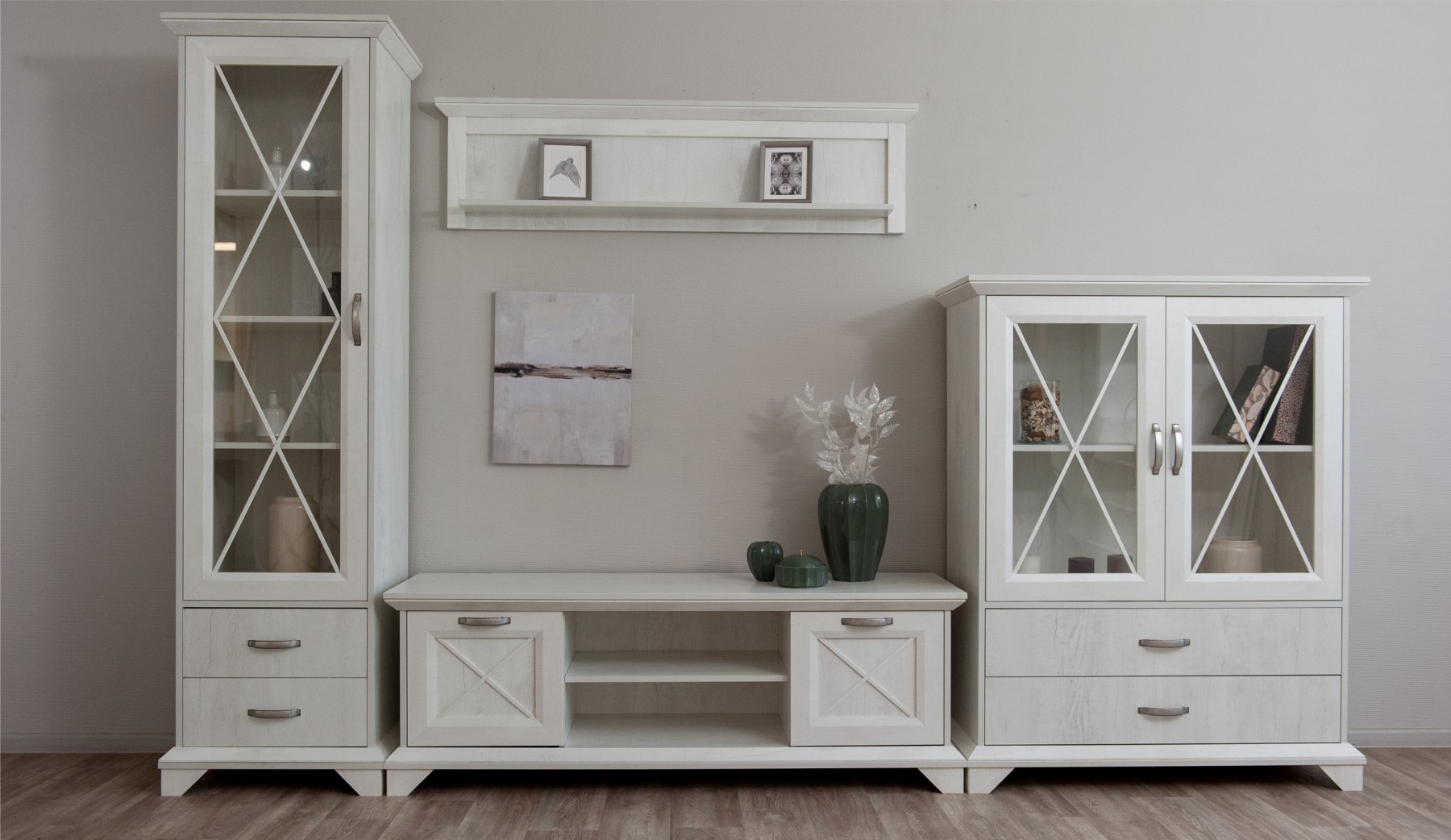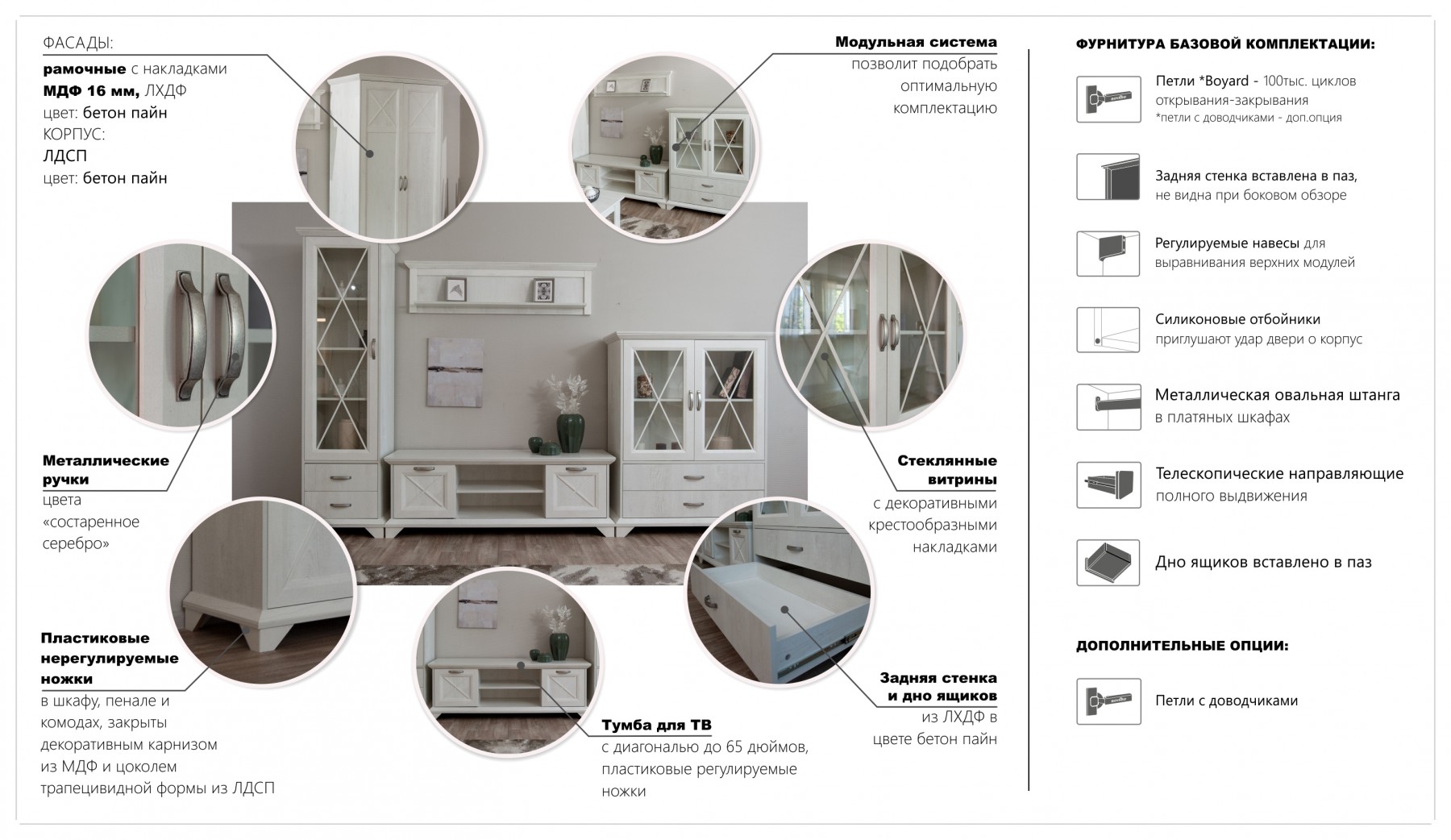 Стенка Лорена выполнена в стиле неоклассика и отличается гармоничным сочетанием простоты, практичности и комфорта. Цвет фасадов повторяет текстуру и рисунок натурального дерева, выполнены в цвете «Бетон пайн». Особый колорит интерьеру придают декоративные крестообразные накладки на рамочных фасадах модулей. Выступающие карнизы всех элементов, фигурные ножки и цоколь подчеркивают стилистику коллекции, а металлические ручки оттенка старого серебра делают силуэт модулей гармоничным и завершенным. В пенале и комоде с прозрачными витринами будут идеально смотреться красивая посуда, антикварный декор и сувениры. Тумба для ТВ с открытыми и закрытыми полками разместит приставки, медиа устройства. Гостиная Лорена создаст уютную атмосферу и подчеркнет вкус владельцев дома. Изделия из набора мебели «Лорена» позволяют легко скомпоновать мебель как для гостиной, так и для спальни.