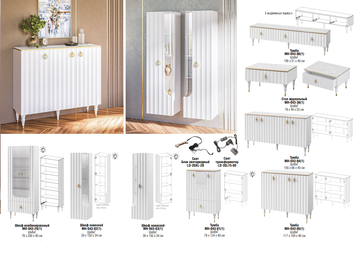код 151738Роскошная модульная коллекция мебели с "волнистыми" фасадами для гостиной. Материал: МДФ покрытый плёнкой, ЛДСП.