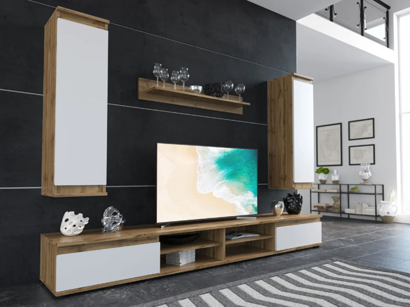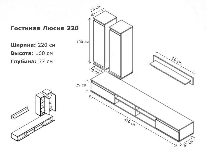 Модель «Люсия 220» – готовое решение для гостиной, которое поможет быстро преобразить и освежить интерьер. Комбинированная расцветка представлена популярным сочетанием натурального древесного тона с нейтральным белым. Элементы набора можно расположить как симметрично (вариант на фото), так и асимметрично, разместив навесные шкафы рядом, а полку сбоку. Мебель продается только комплектом.