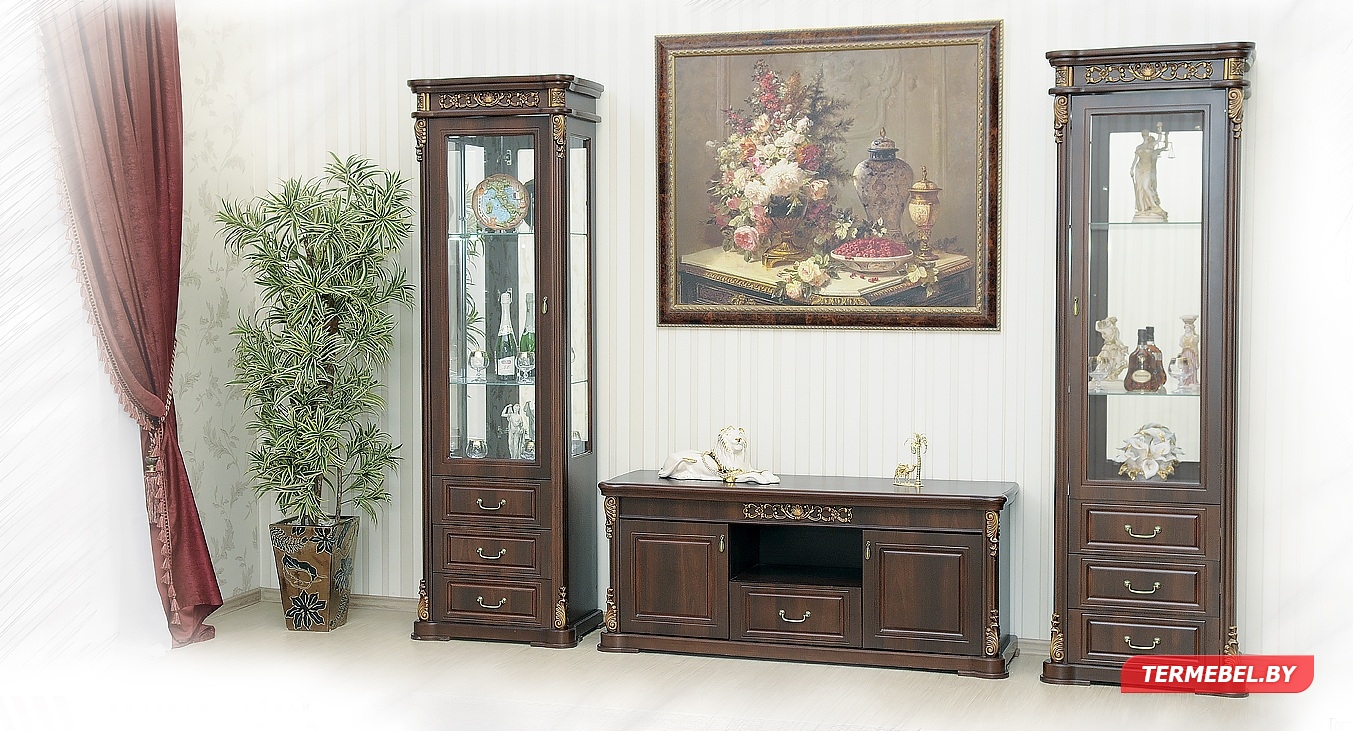 код 103501Гостиная в классическом стиле. Доступна в двух цветах. Фасады радиусные: МДФ с фрезеровкой и шелкографией.