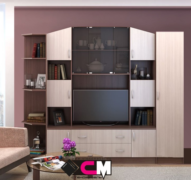 код 103817В гостиную, входят модули: центральная секция пенал с полками и торцевая секция.