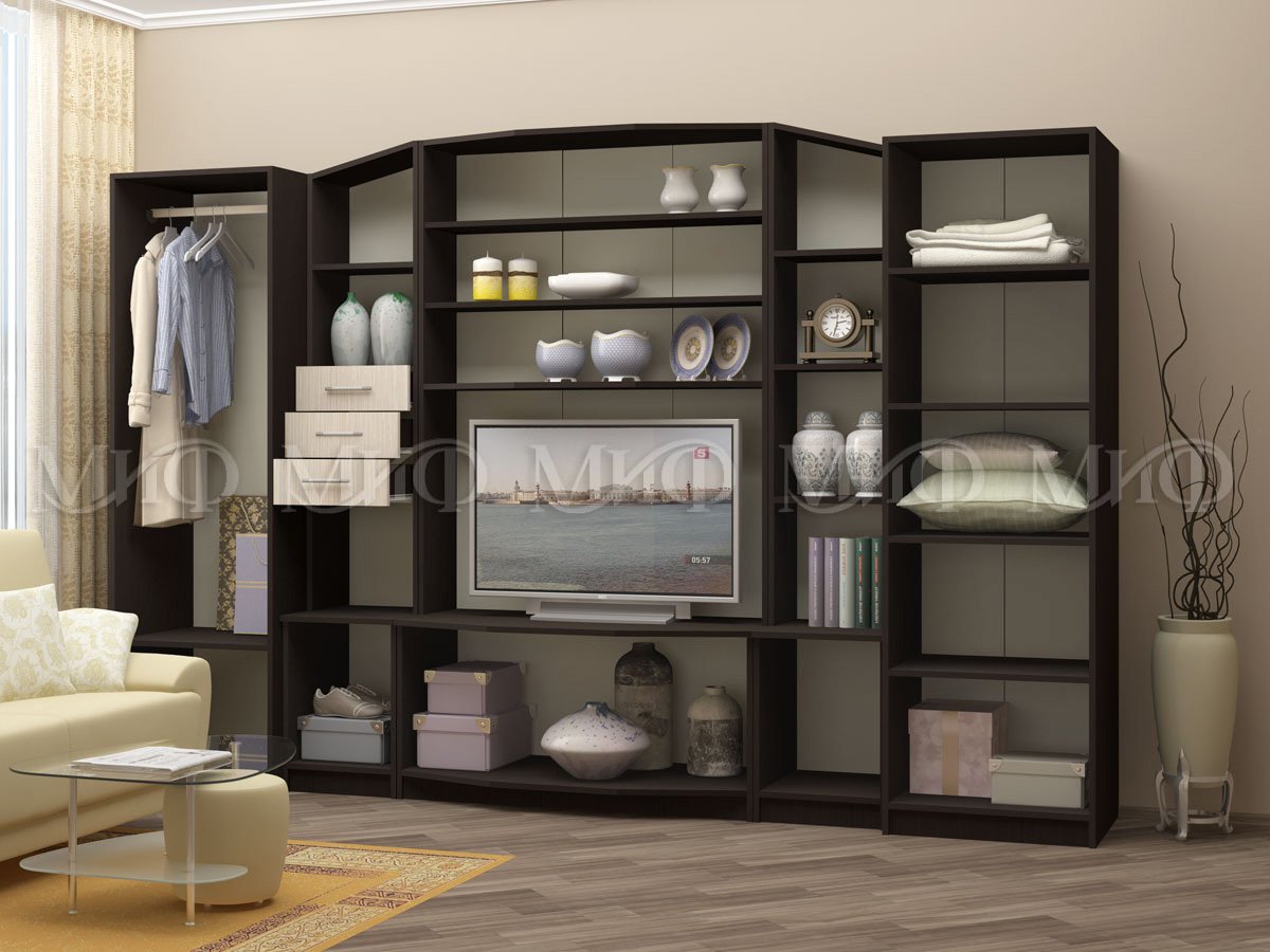 Функциональность стенки представлена наличием множества открытых и закрытых полок.