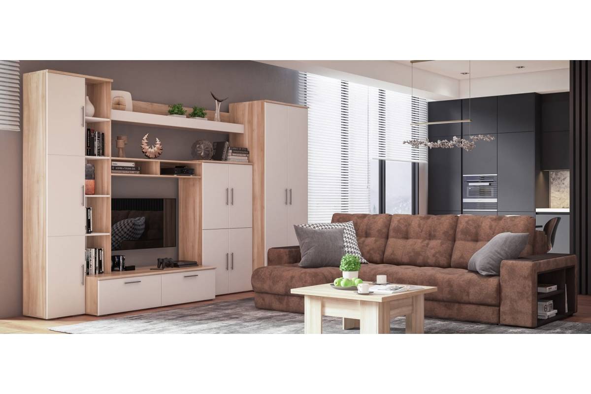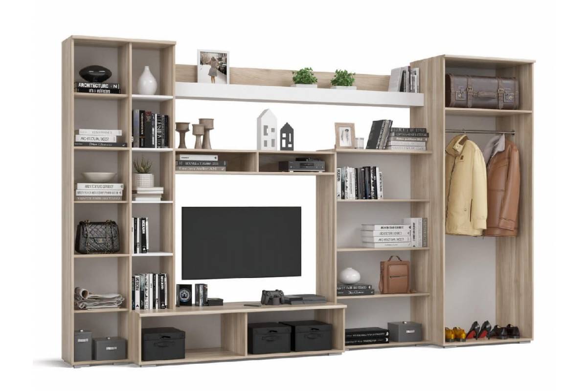 Стильная гостиная с витринами, пеналами, ящиками и местом для ТВ.