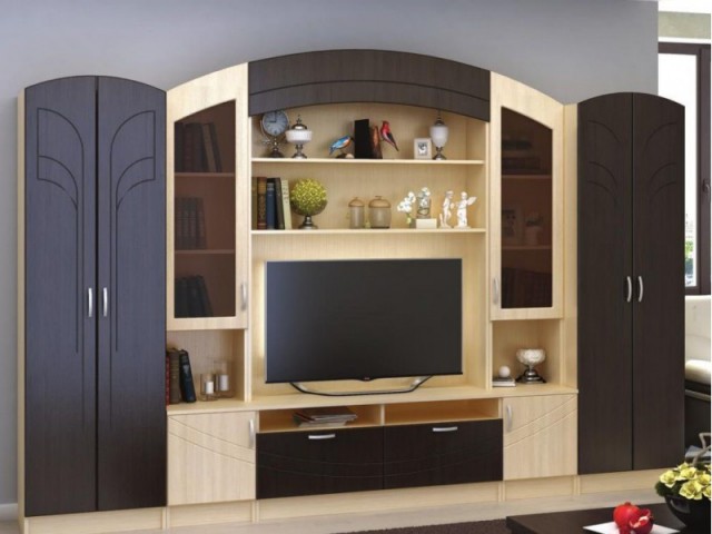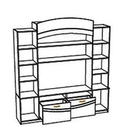 Комплект состоящий из центральной секции, пенала и шкафа. Наличие книжных полок, ниши для ТВ, ящиков и шкафчиков.