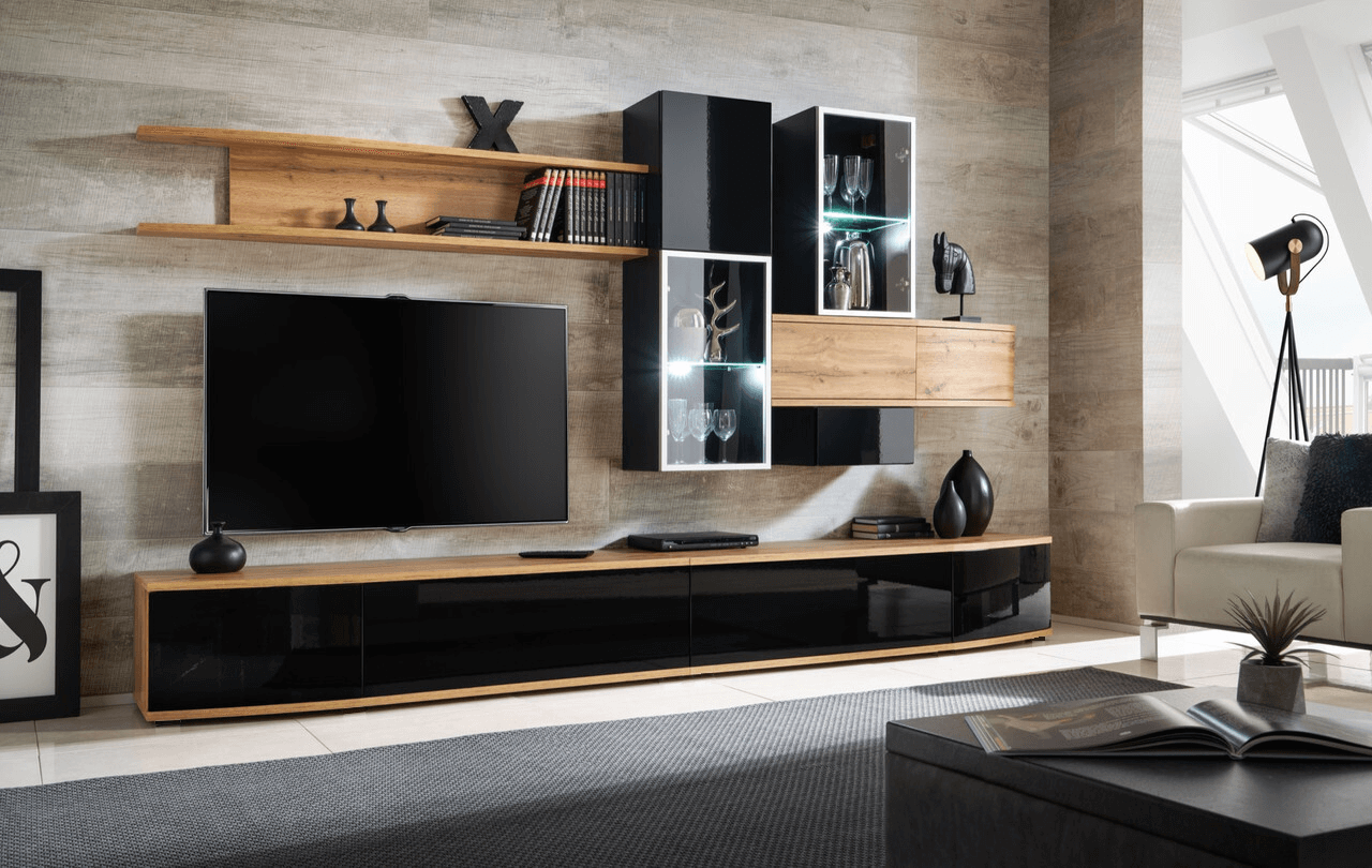 Современная модульная коллекция в сочетании теплого дуба и черного. Материал: ЛДСП.