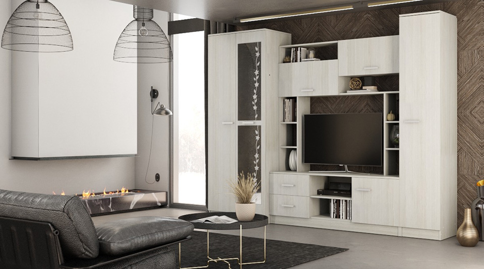 В гостиную, входят модули: центральная секция пенал с полками и торцевая секция.