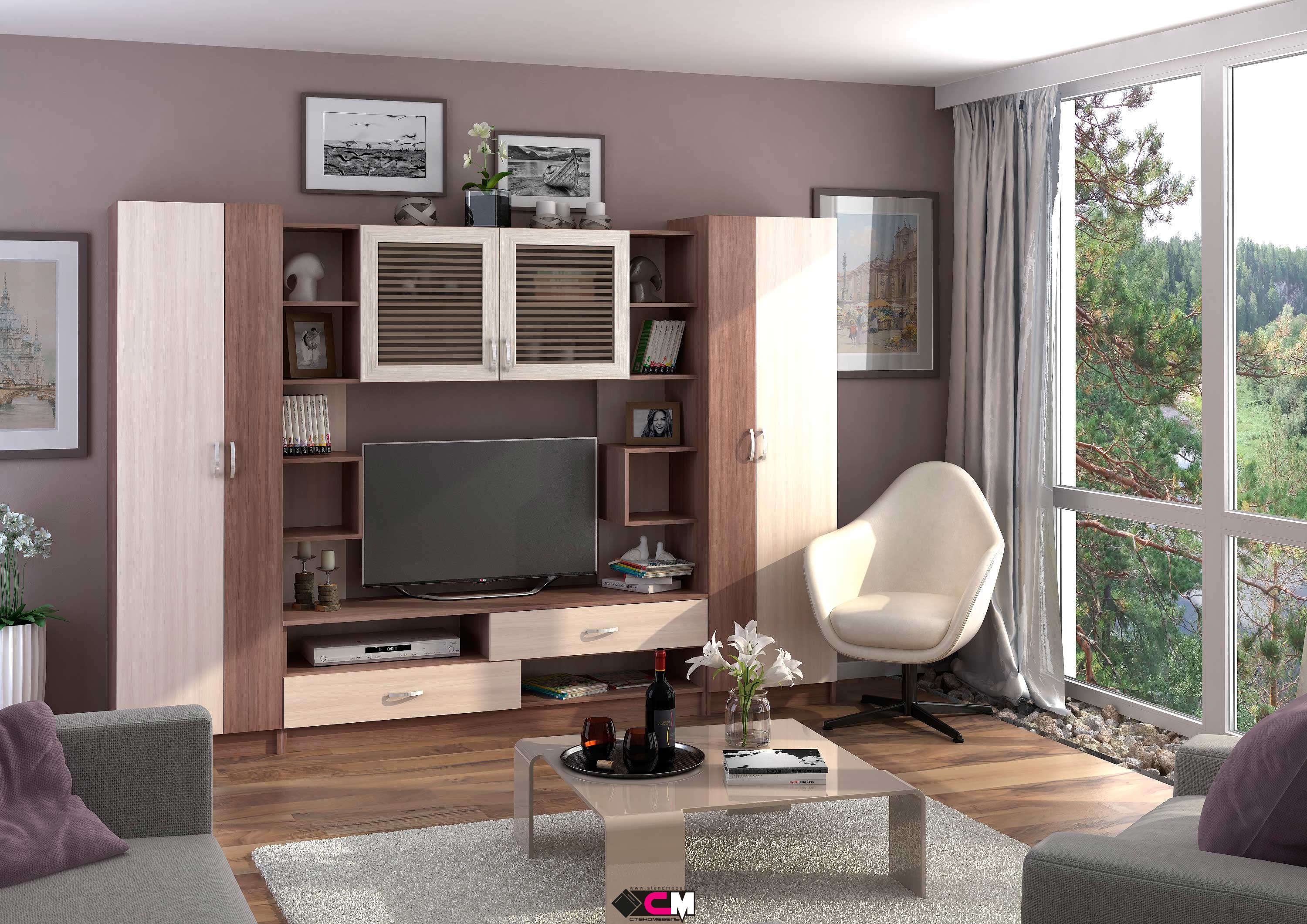 код 103821Прямая модель гостиной в светлых тонах. Большая вместимость, ниша для ТВ.