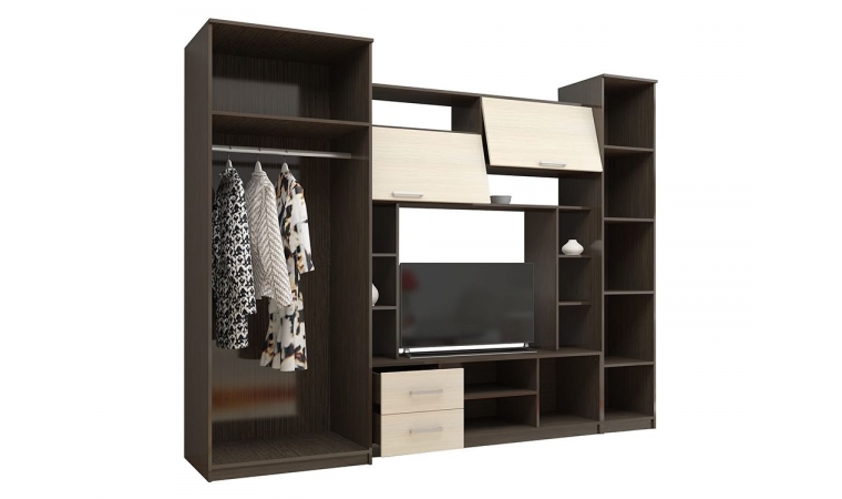 - Комбинированный набор для гостиной имеет два выдвижных ящика с использованием механизма полного выдвижения и плавного закрывания, дно ящика выполнено из ЛДВП в цвет корпуса