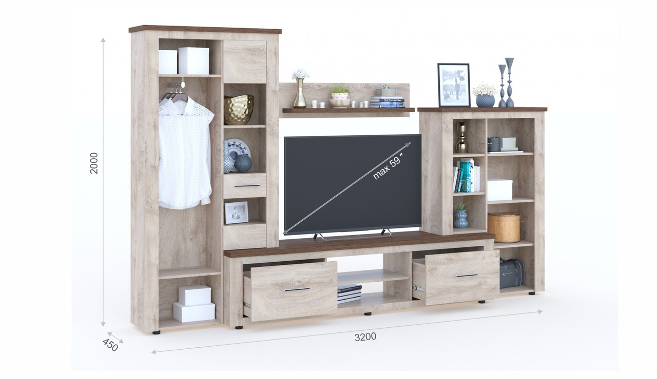 - TV-ниша (ШхВ): 131х91 см (max TV 59″).
