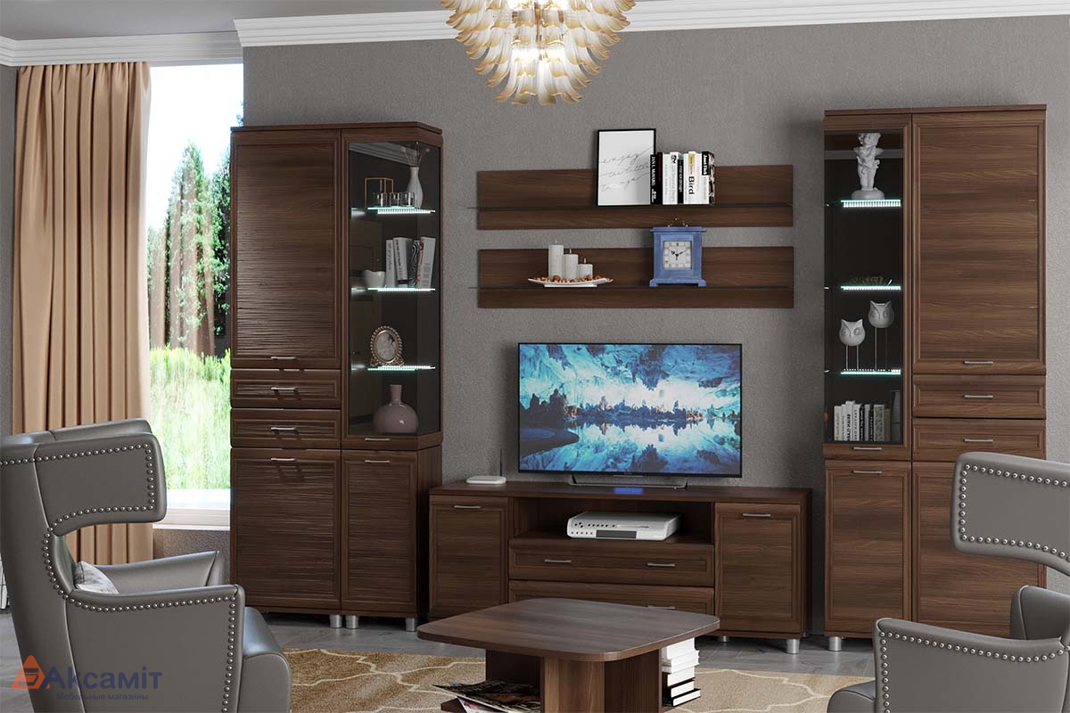 Габариты (ШхГхВ): 280х45х140 см. Материал: МДФ, ЛДСП, стекло.