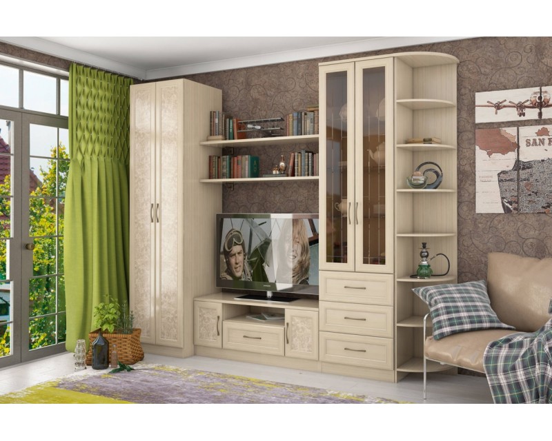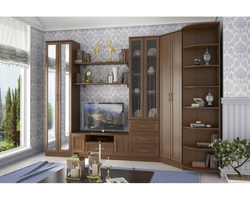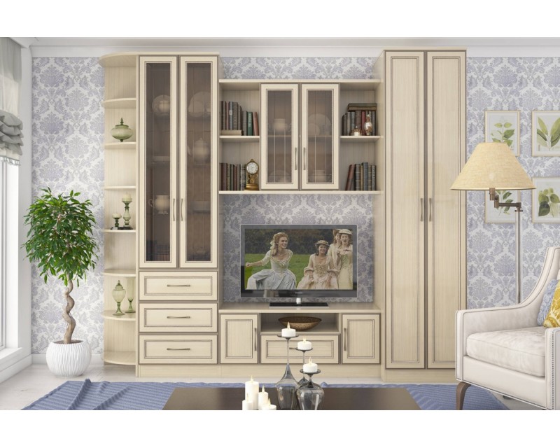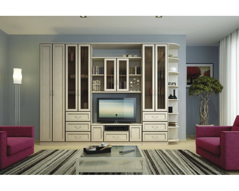 Современная стенка в гостиную с нишей для ТВ, выдвижными ящиками, распашными шкафчиками и открытыми полками.