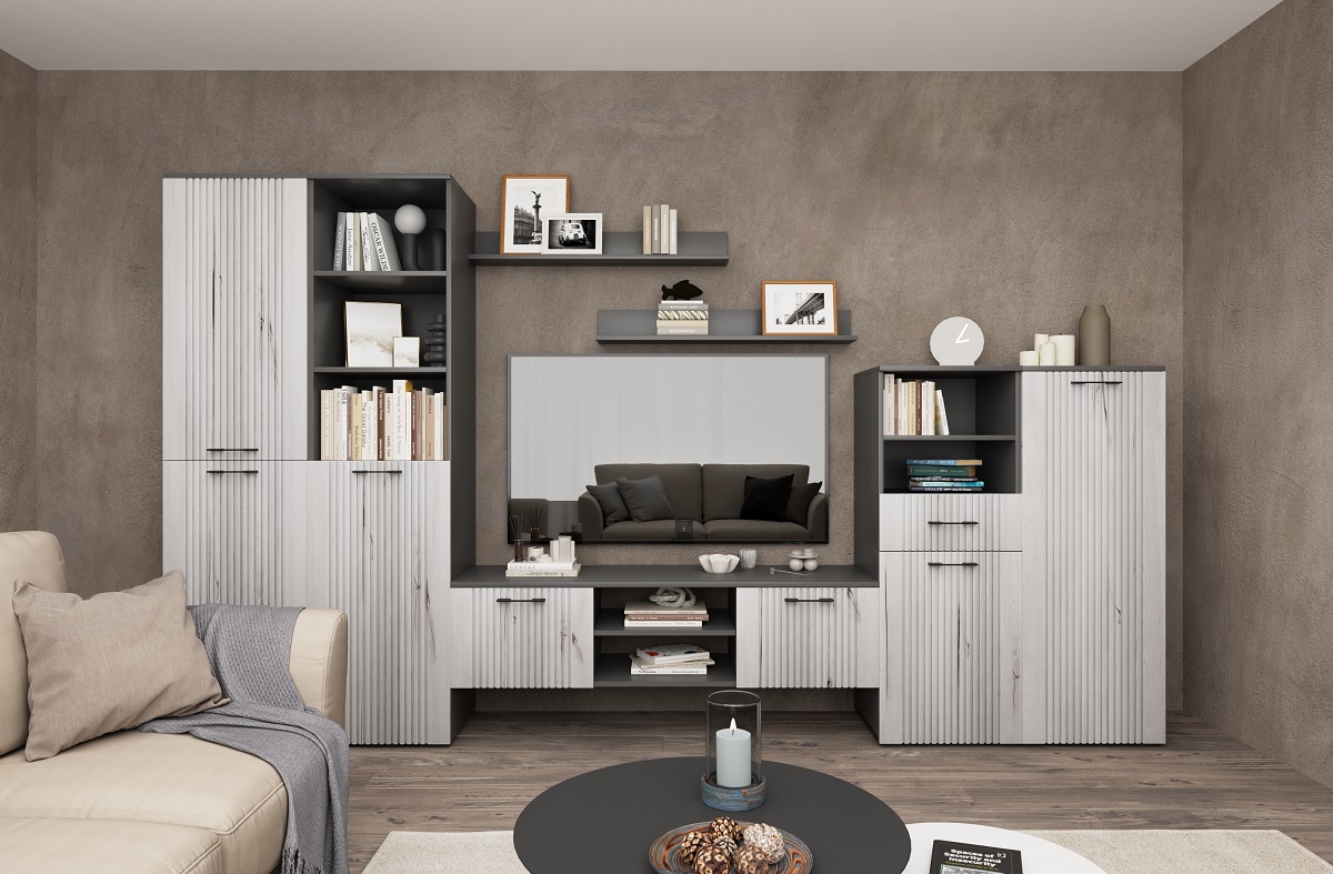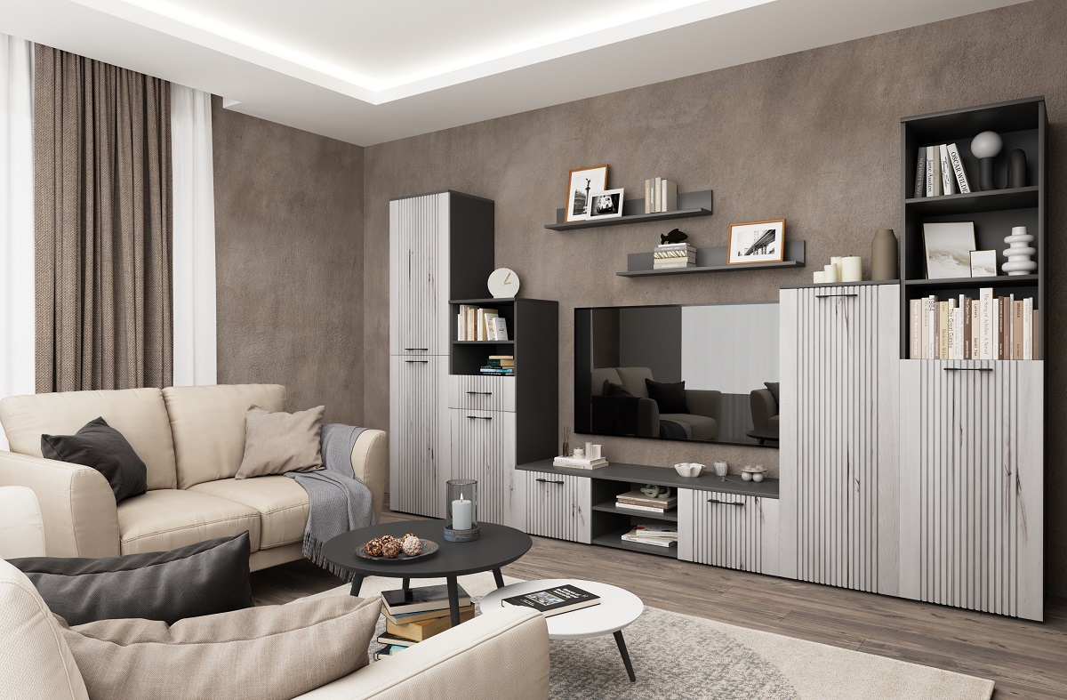 код 145534Модульная гостиная с матовыми рифлеными фасадами.